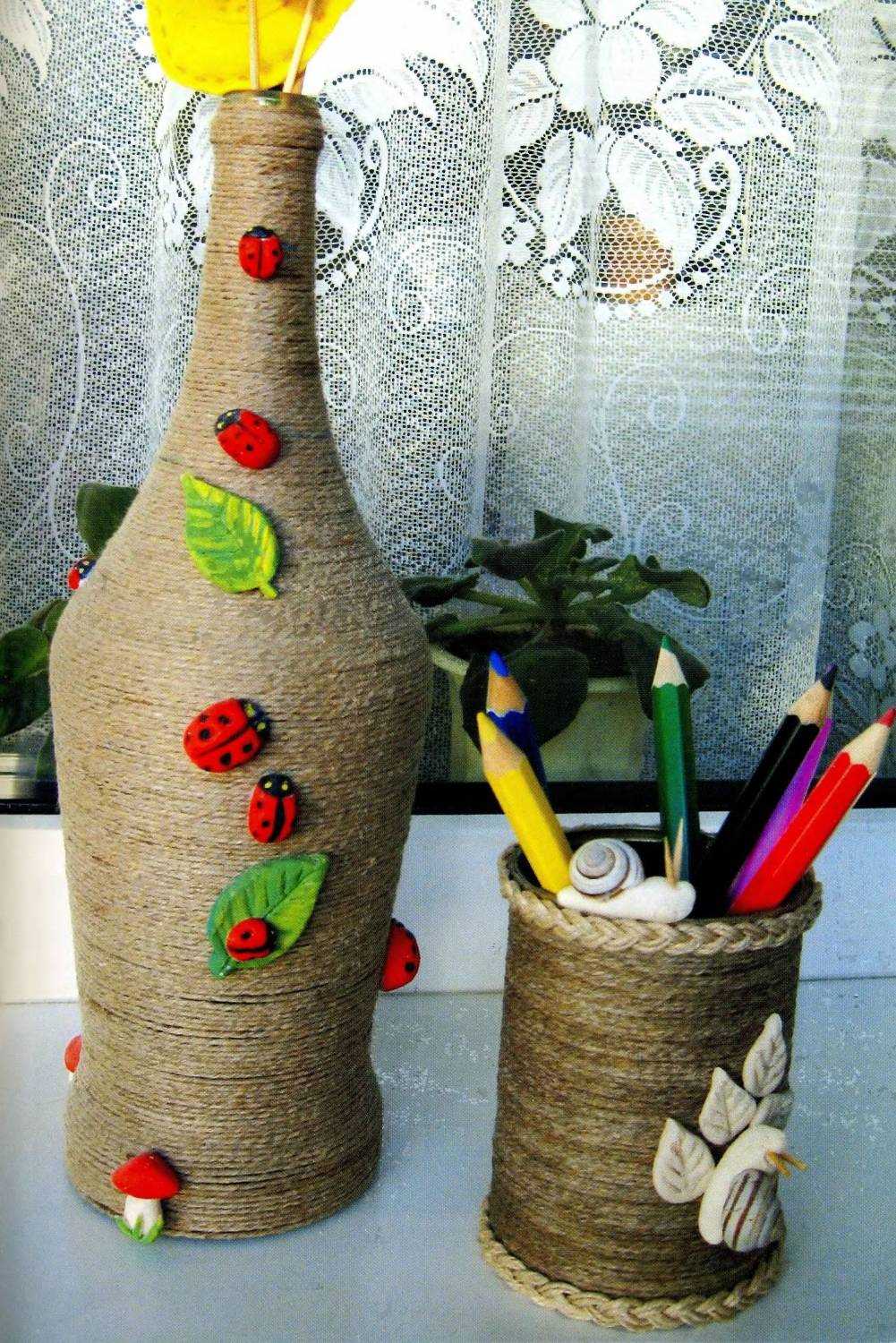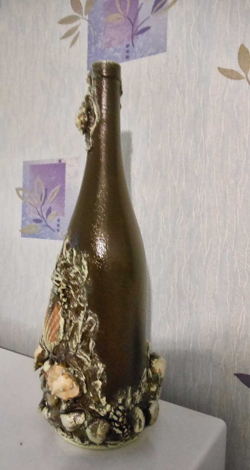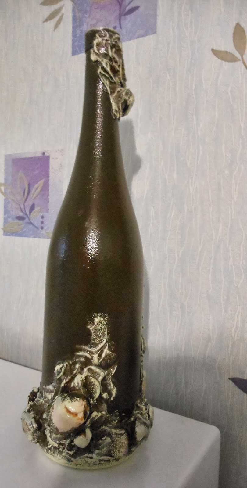 Après séchage complet, la bouteille décorative est vernie. En utilisant cette technique, il est réaliste de créer des décorations pour tous les intérieurs.