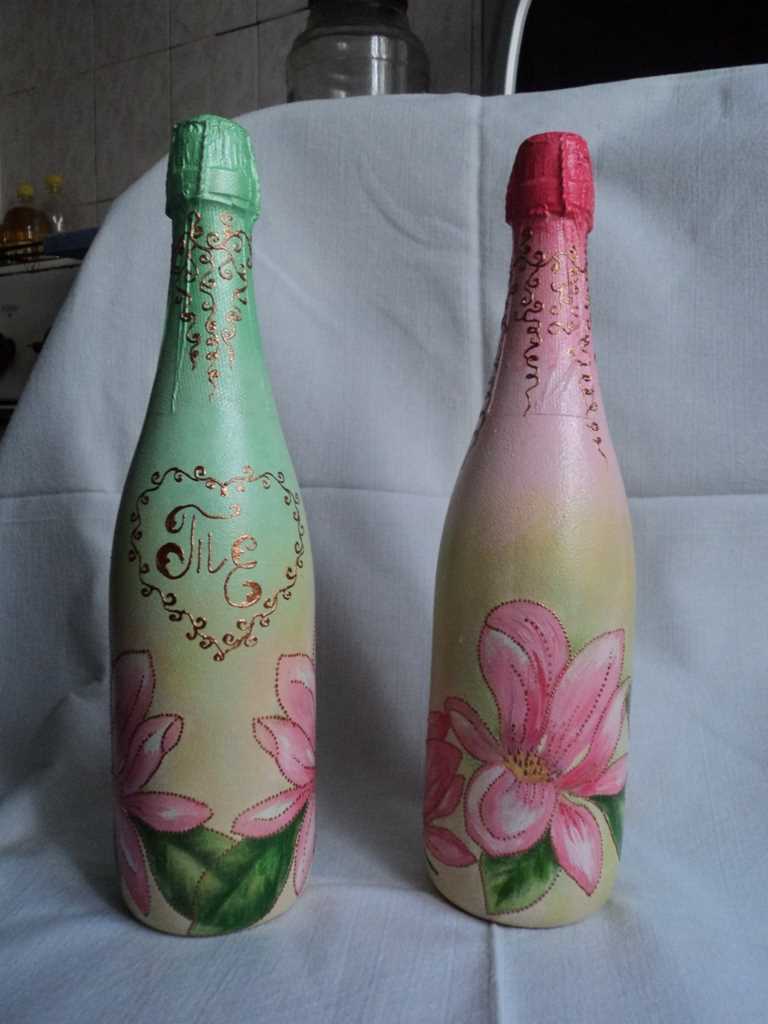 La bouteille nettoyée est recouverte de plusieurs couches de vernis acrylique, chacune étant bien séchée. Il est tout à fait acceptable de laisser le récipient transparent ou de le recouvrir de n'importe quelle couleur (les peintures acryliques sont préférables). Ensuite, des éléments sont découpés dans des serviettes et collés à la surface sur du PVA.