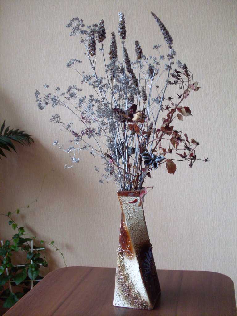 - Les bouquets dans un vase de brindilles et de fleurs séchées sont monnaie courante, mais sont souvent très beaux. Vous pouvez également décorer un vase en collant des branches inhabituelles et en les attachant avec des rubans.
