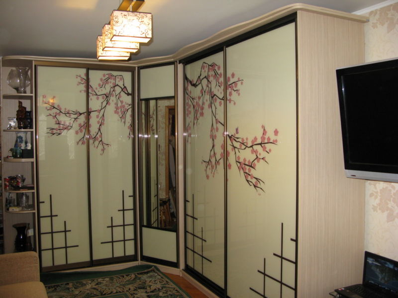 - Verre trempé Les armoires avec des murs en verre translucide, mat ou brillant ont fière allure dans des pièces conçues dans un style hi-tech, minimalisme ou moderne. Dans le même temps, une large gamme de couleurs et de décorations du verre laisse libre cours aux décisions en matière de conception. L'inconvénient de cette solution est son coût relativement élevé.