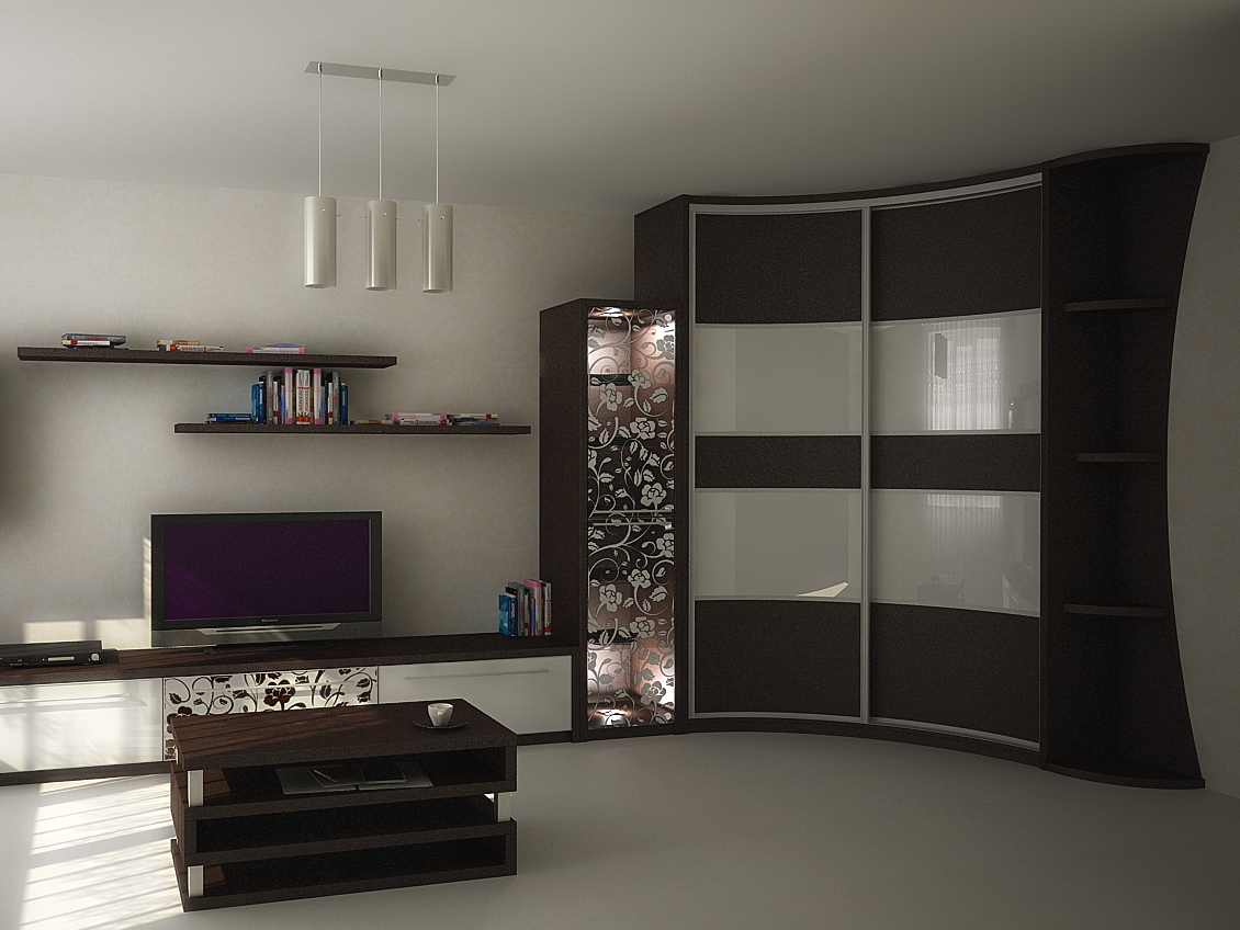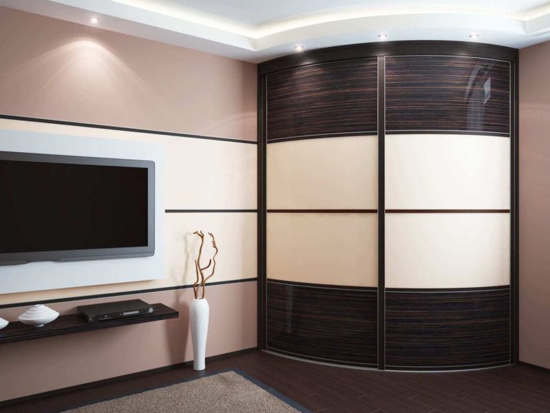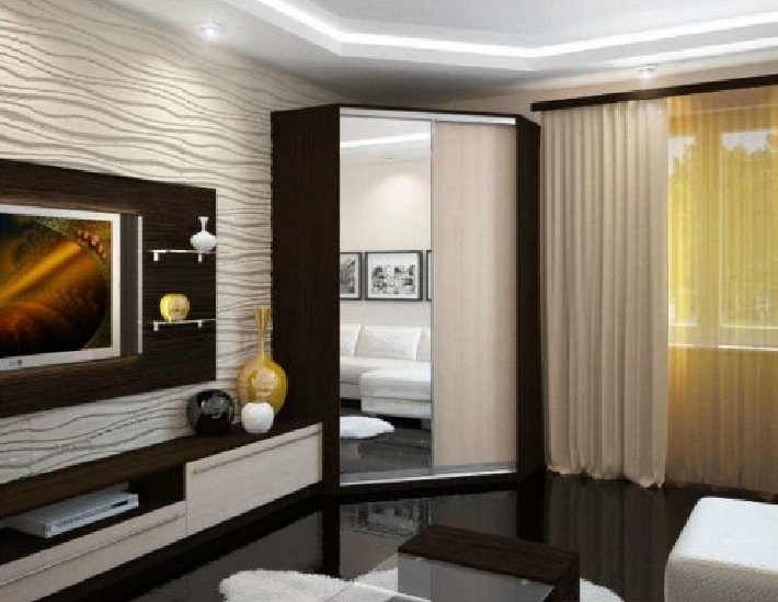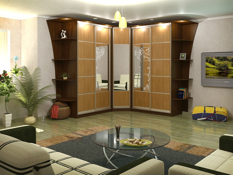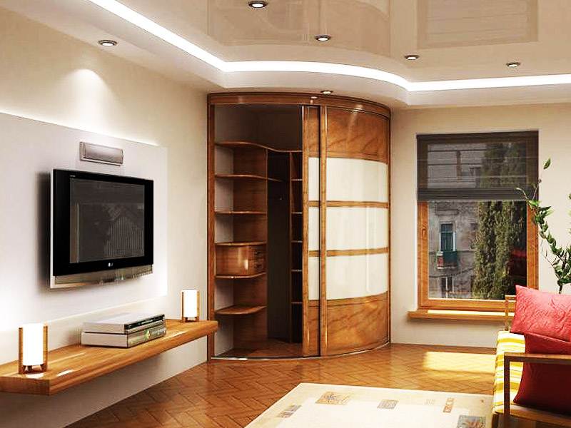 Pour le salon, l'option de coin est bien meilleure qu'une armoire. Le modèle à rayon concave sera particulièrement beau. En raison de la forme spéciale, le coin aura l'air plus arrondi, tandis qu'il y aura plus d'espace libre au centre du salon.
