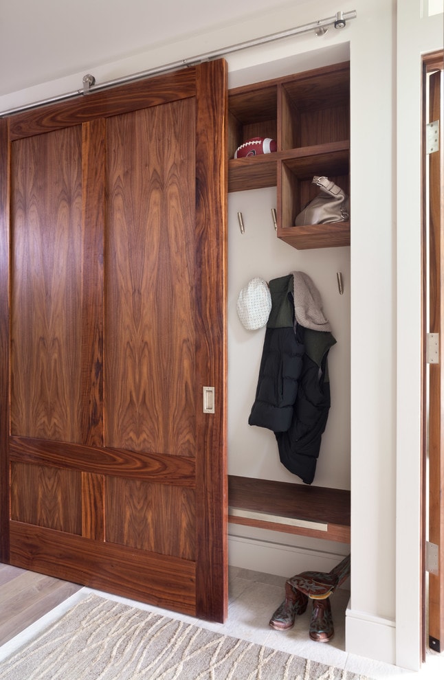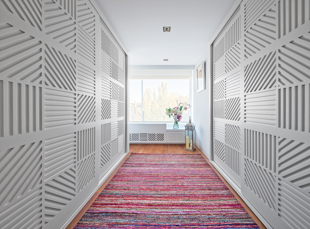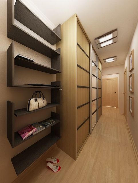 La disposition angulaire de la garde-robe est la meilleure solution dans les petits couloirs de forme irrégulière. Les meubles de coin permettent de gagner de la place et d’accommoder plus de choses. Il est généralement fait à des mesures individuelles. Les casiers intégrés permettent de gagner beaucoup d’espace. Ils sont compacts, faciles à utiliser, rapidement montés. Cependant, il n’ya pas toujours de possibilités techniques pour placer de tels meubles.
