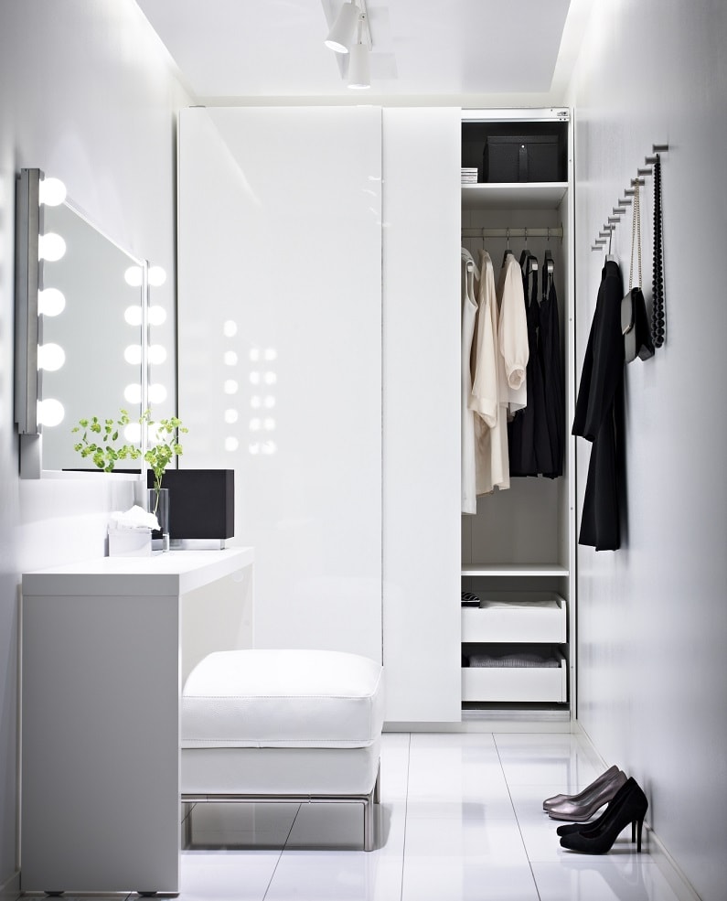 - Vous devez acheter une armoire coulissante. Les autres options ne conviennent pas. Les portes ne s'ouvrent pas dans les compartiments. Ils se déplacent doucement sur les côtés, de sorte que cela ne nécessite pas beaucoup d'espace.