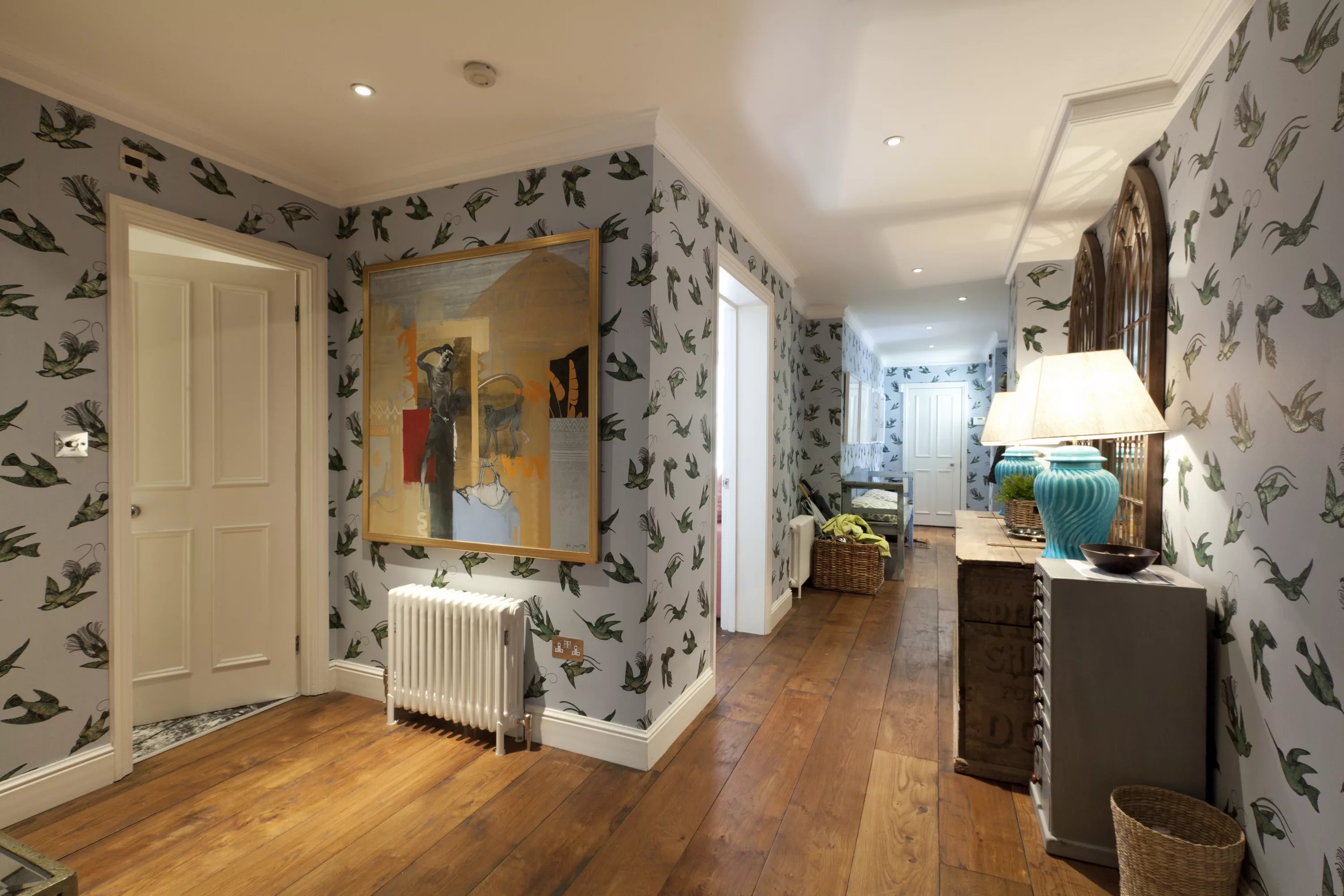 Pour un couloir avec des portes lumineuses, les papiers peints de couleur pastel sont parfaits