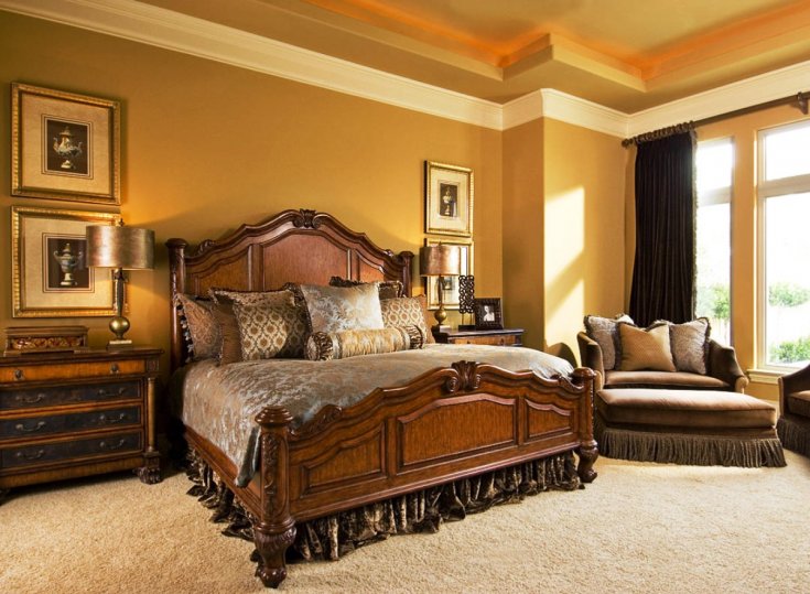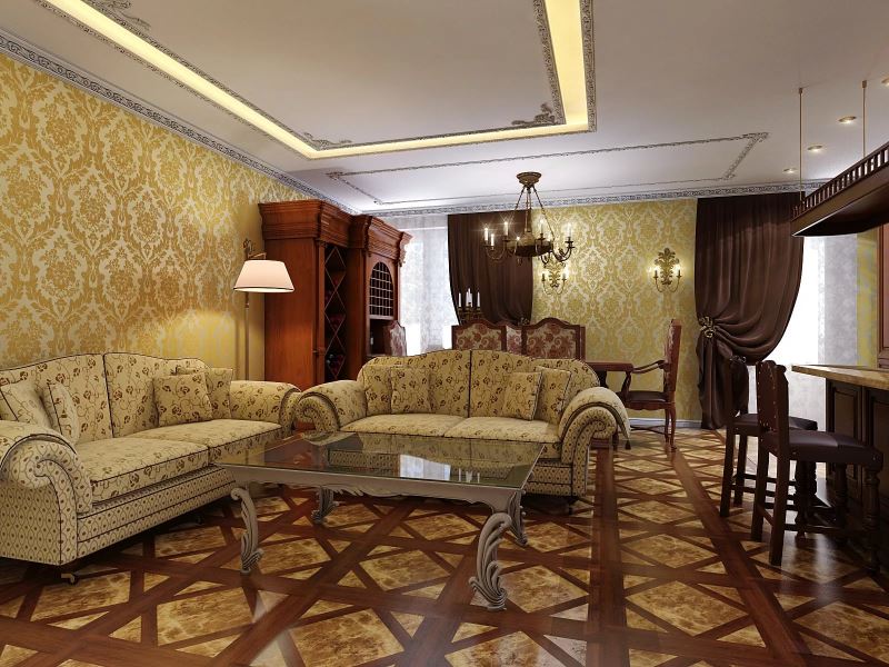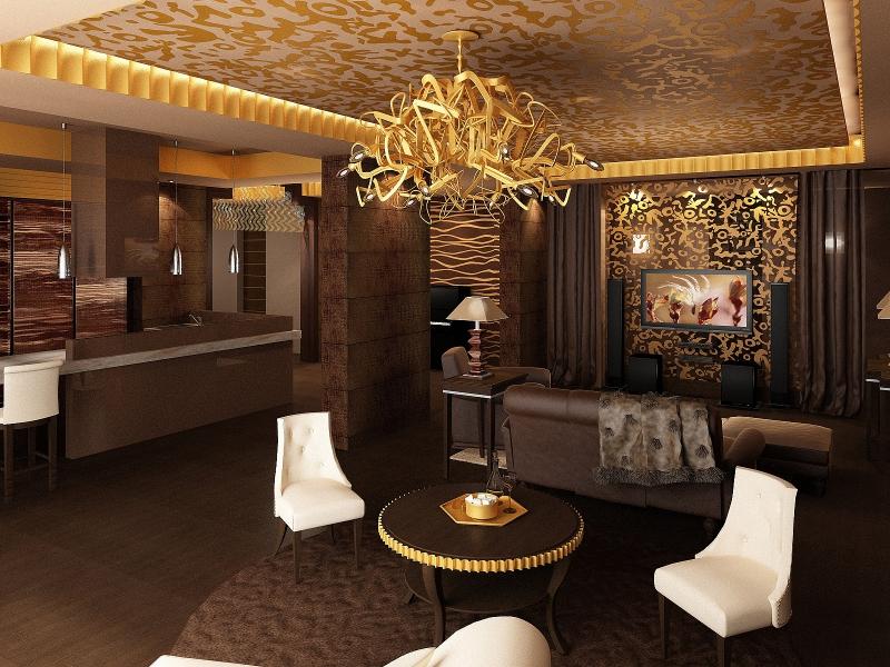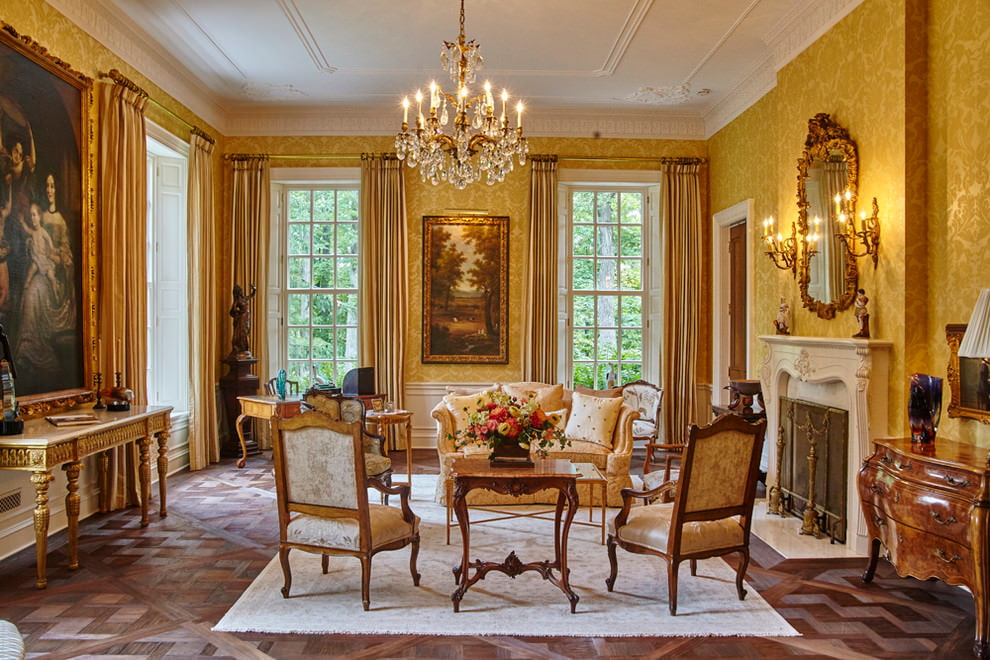 Important! Cette couleur ne doit pas dominer, quel que soit le degré de brillance. Un excès ou une surabondance d’or détruit non seulement la noblesse générale de l’intérieur, mais peut également ruiner tous les investissements en réparation. En pourcentage, il ne devrait pas dépasser 20-30%.