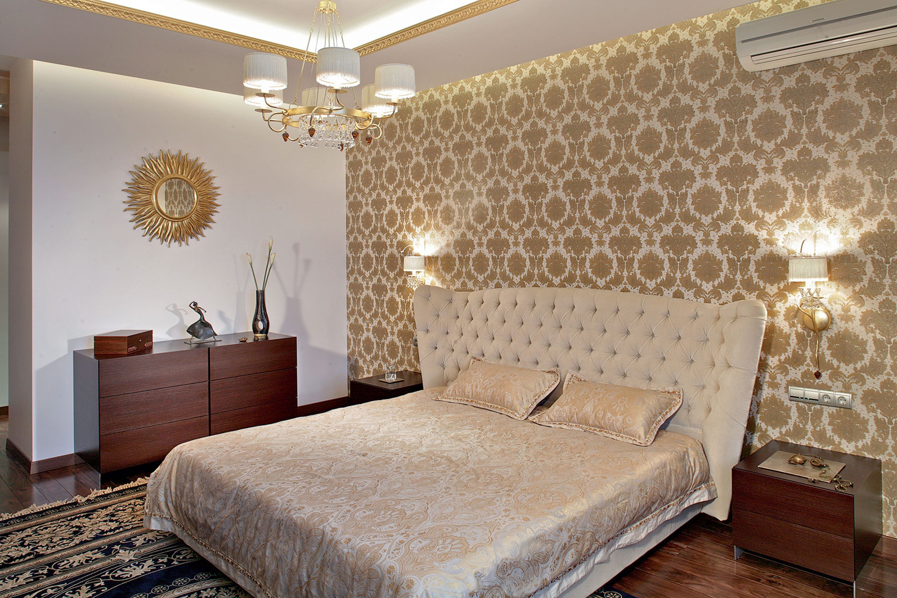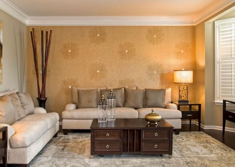 S'il y a une surabondance de brillance sur les murs, l'intérieur risque de perdre l'atmosphère de sophistication. Il est donc préférable de combiner du papier peint avec un revêtement de mobilier en or ou avec des ornements sur les rideaux.