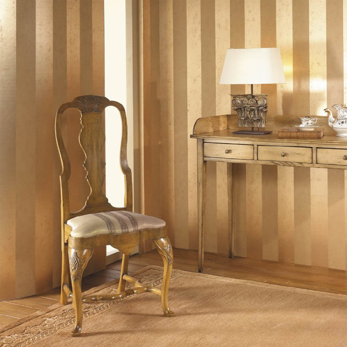 Une chambre dans un style classique, où les rayures verticales sur le papier peint soulèvent visuellement le plafond
