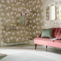 Les collections de designers célèbres sont souvent dominées par des couleurs vives et positives: jaune, rose, chocolat, turquoise. La priorité est un jeu de couleurs complexe: nuances de vert olive et vert, aubergine, vague marine. Les motifs floraux et floraux sont également très populaires. Cependant, s'ils utilisaient auparavant un petit motif avec des fleurs sauvages ou des roses remplissant tout l'espace, à en juger par la photo de 2019, le dessin a changé et le papier peint a commencé à être libéré avec des motifs floraux plus volumineux. Pour les adeptes de classiques conservateurs à l'intérieur, les tons pastel clairs restent pertinents. Les papiers peints sont sélectionnés pour des articles ménagers spécifiques ayant une texture similaire. Le papier peint peut également être combiné avec du tulle, des accessoires et des revêtements de sol.
