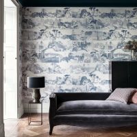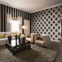 Horizontal Il consiste à utiliser des bandes. Pour cette méthode, il est préférable de choisir des matériaux contrastants avec un motif brillant. Ainsi, pour donner à la pièce des motifs rétro, il est recommandé de coller le papier peint en bande verticale sur la partie inférieure de la pièce et d'encadrer la bordure supérieure.