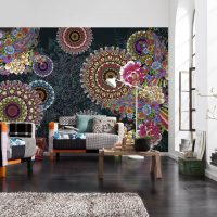 Pour un design maximaliste, il est préférable de prendre des fonds d'écran avec de grandes couleurs et des images ethniques. La conception aura l’air exclusif sous la forme d’éclaboussures d’une paire de couleurs accrocheuses sur une base blanche comme neige.Une autre tendance est le flou des contours. Le papier peint a l'air d'être surveillé dans l'eau. Ils créent un effet de transe et sont appréciés des fans de la culture hippie.