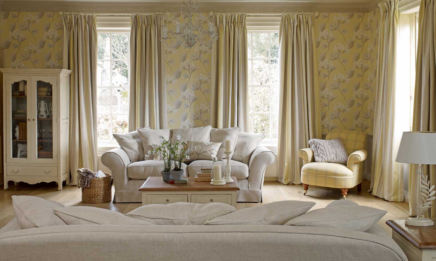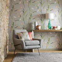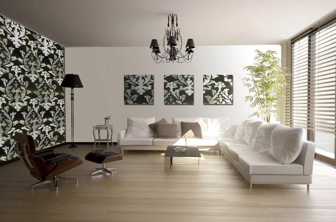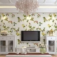 Grâce à son caractère unique et à sa durabilité, les peintures murales gagnent à nouveau en popularité. Vous pouvez ajouter du confort au salon en utilisant des images de la cheminée et du feu. Une bibliothèque d'imitation ajoutera sophistication et aristocratie. Les tissus à motifs végétaux sont en demande. Ils sont utilisés pour transformer les lieux en un coin de la nature. La tendance la plus récente de 2019 est celle des fourrés de bambou dans les tons vert et jaune vif. Dans une petite pièce, le papier peint à petites fleurs a fière allure. Mais pour un salon spacieux, les grandes fleurs conviennent en combinaison avec du papier peint uni.