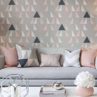 Pour commencer, les concepteurs sont invités à choisir une palette, puis à réfléchir aux formes et motifs géométriques. Ainsi, la gamme froide augmente visuellement même une petite zone et la chaude la rend plus vive et dynamique. Pour joindre, il est préférable de sélectionner des couleurs proches ou, inversement, diamétralement opposées. Coller chaque mur dans une tonalité différente pour un résultat spectaculaire. Vous pouvez créer un dégradé croissant, par exemple du foncé au blanc, y compris les nuances intermédiaires. Les ornements ne doivent pas crier les uns sur les autres.