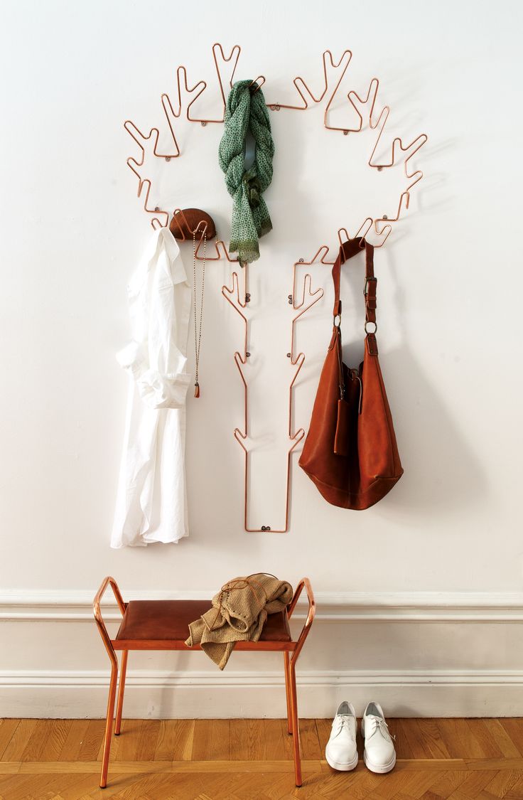 A beautiful element of decor can even be ... a hanger. Simple hanger with hooks for outerwear or other clothing. A base is attached to the wall, which is often found in the form of flat tree branches with ordinary hooks. Ideas are the most eccentric: bicycle handlebars, antlers, plumbing taps. A simple rough board as a basis will give the entrance hall a shade of primitiveness and naturalness. Experiment with a hanger for the kitchen: what to hang spatulas and tongs for?