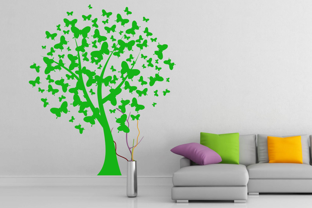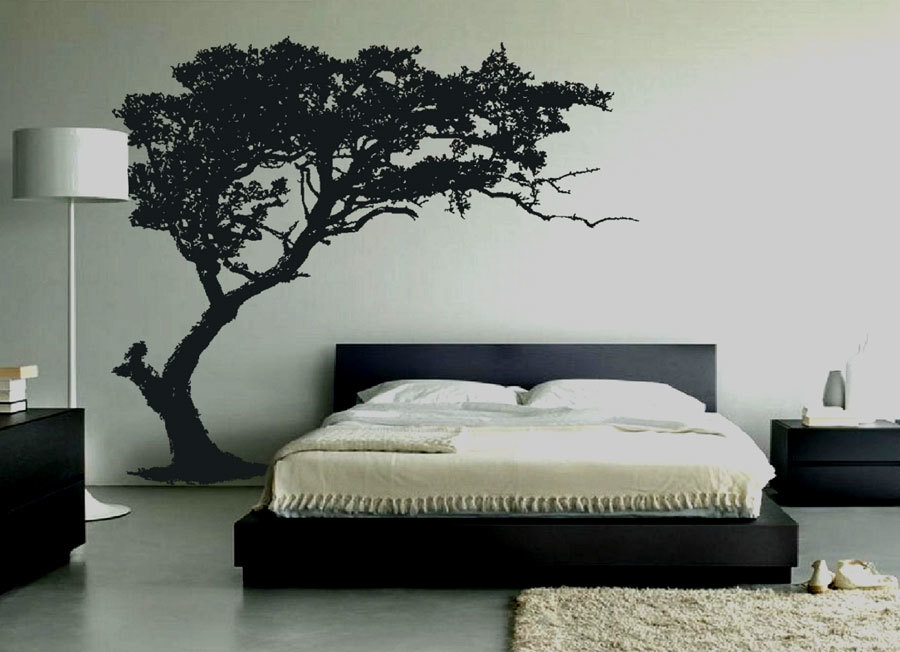 The option of interesting wall decoration can be even simpler: choose a sticker, buy, stick, and forget. Black stickers look great on a light or white background. As a rule, trees, flowers, various toons are popular. The simplest elements of the zentangle are good. It is desirable that the background is monophonic and the patterns on the wallpaper do not swear with a sticker.