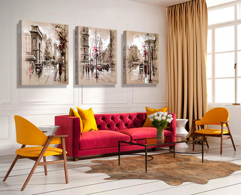 Do not strive to choose the style and colors so that they exactly fit the interior, let the picture create dynamics in the room. Vivid impressionism will dilute the gray-white-beige color scheme, and romanticism will fit even if you have austere furniture without unnecessary details and the room is designed purely functional.