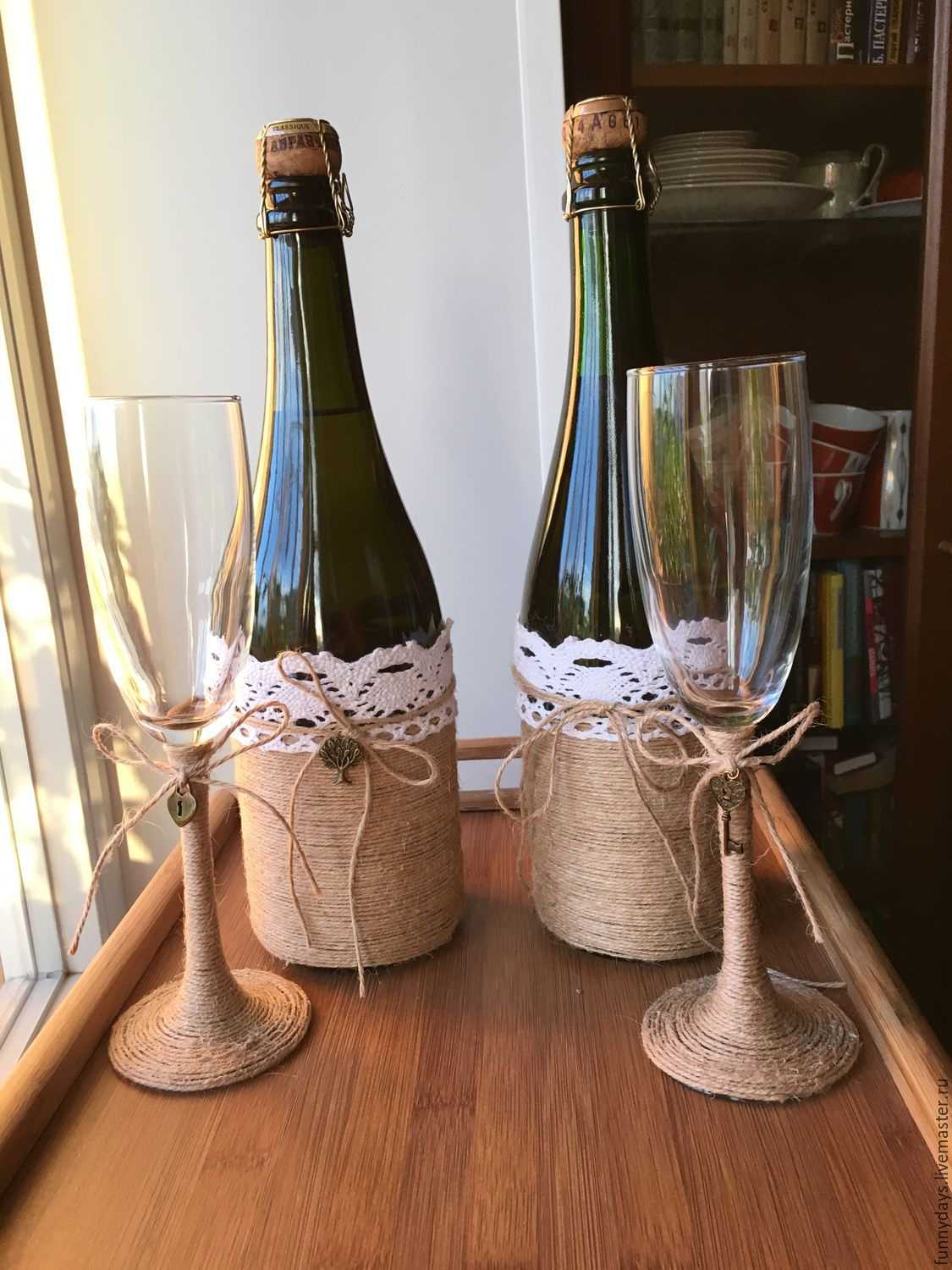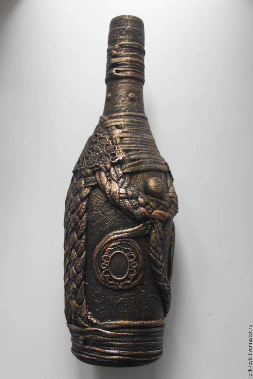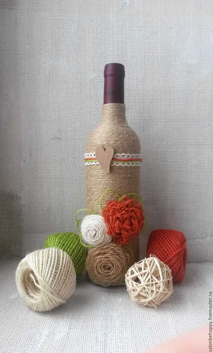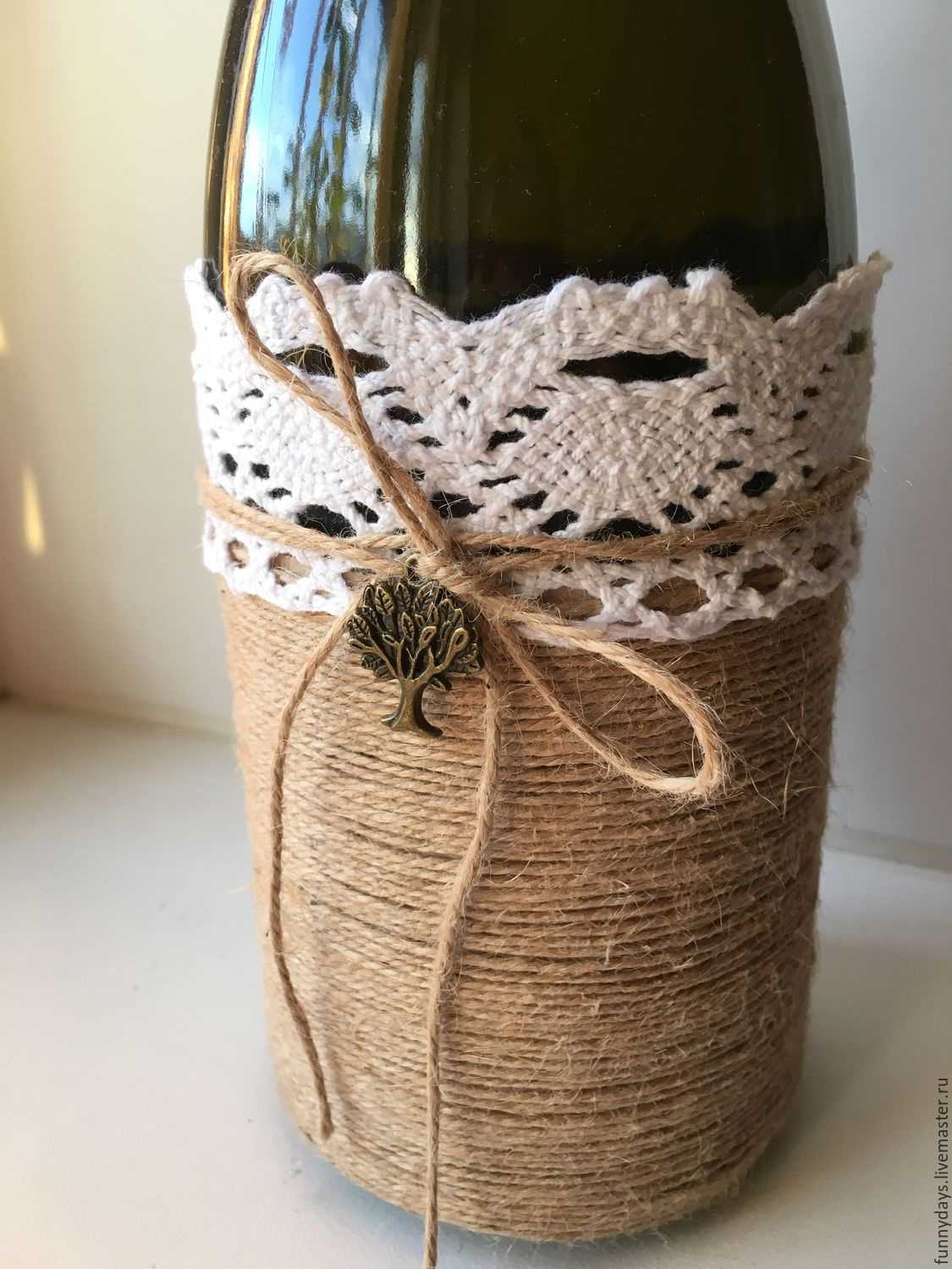 In a similar way, you can decorate a bottle of wine that has not yet been opened, and after a memorable event, use the container as a memory. For the decor of wine bottles with your own hands, you can use the traditional needlework techniques - macrame, crochet and knitting, braiding with beads.