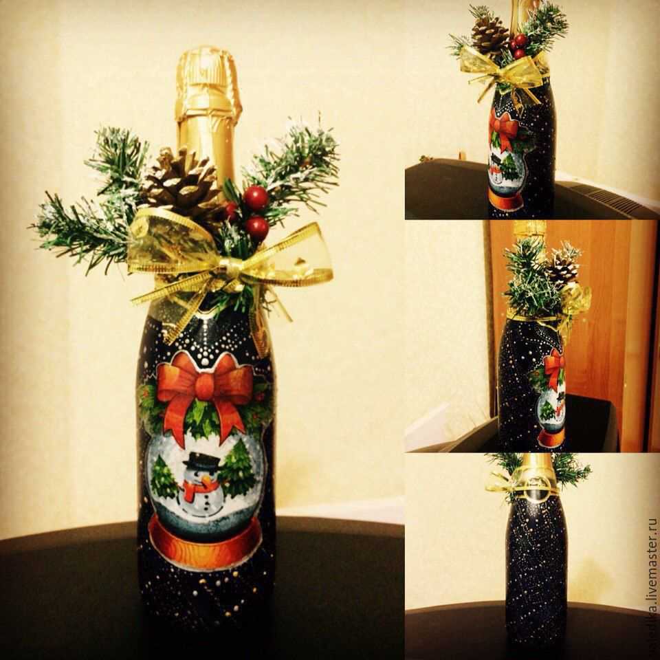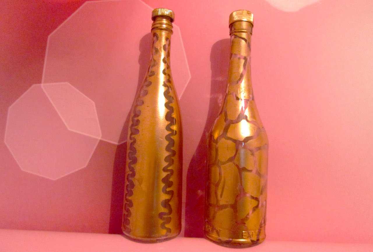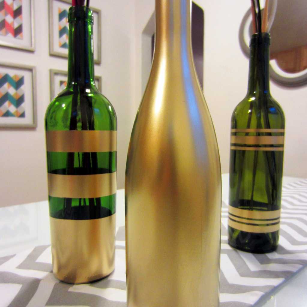 The golden bottle looks luxurious, this technique is suitable for any occasion. For the New Year, you can put a spruce twig with traditional decorations in an empty container. An excellent budget option that allows you to do without buying a Christmas tree.