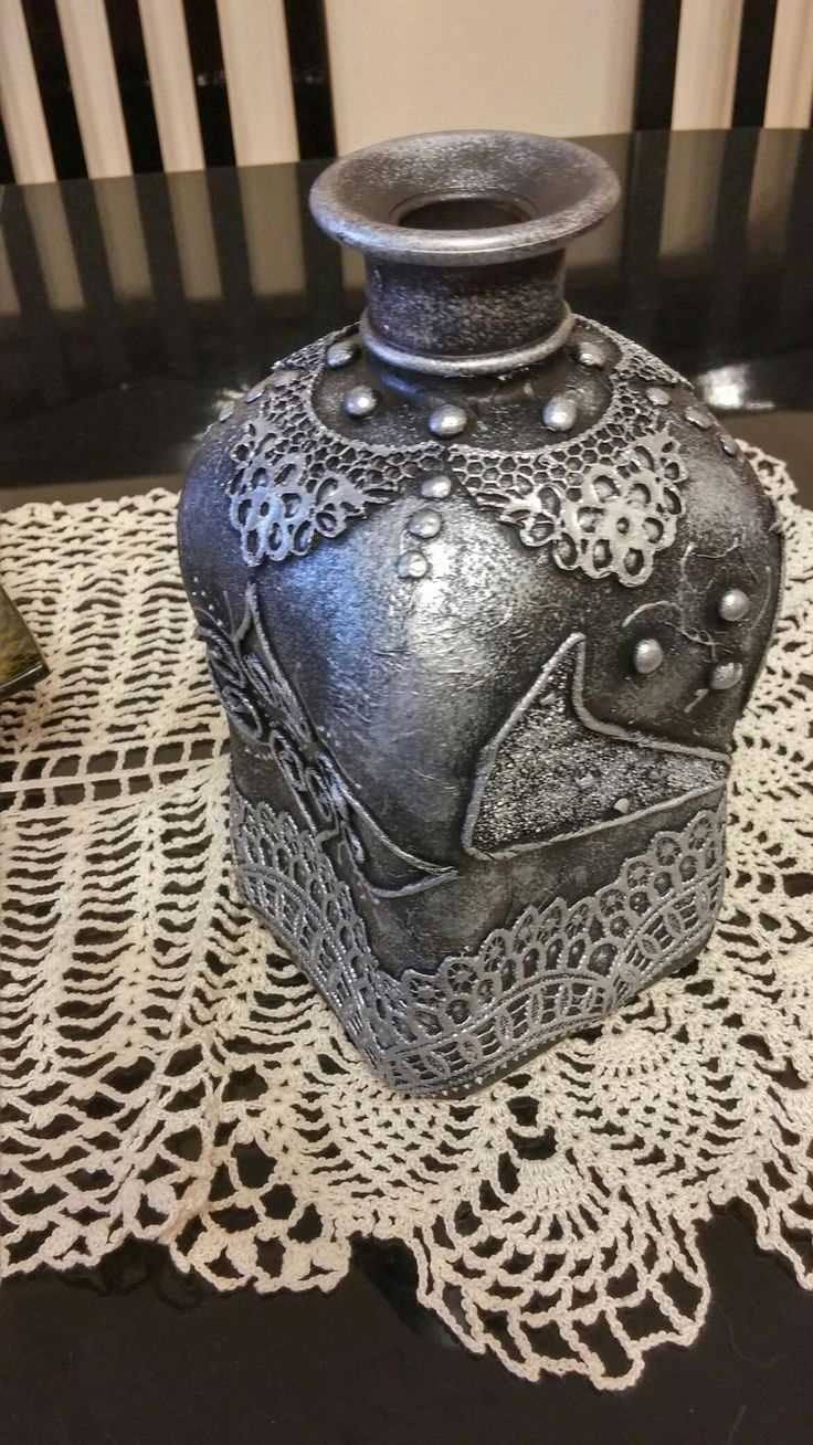 Exterior surface decoration with bulk materials is another simple technique. It’s easy to make designer bottles out of regular beer houses using the transformation of the exterior. An original mosaic base can be easily obtained by gluing pieces of shell onto the glass and coating them with paint. Then you can use any other technique.