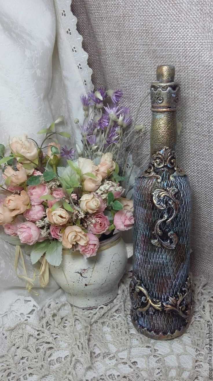 The easiest way is to decorate glass bottles by painting inside or out. For this, transparent containers of different volumes are needed. If they are painted in one color, they will look like a souvenir set. Such items can be combined in 2-3, forming “duets” and “trio”. It is best to use decorated bottles as flowerpots for dry ikebana or artificial flowers.