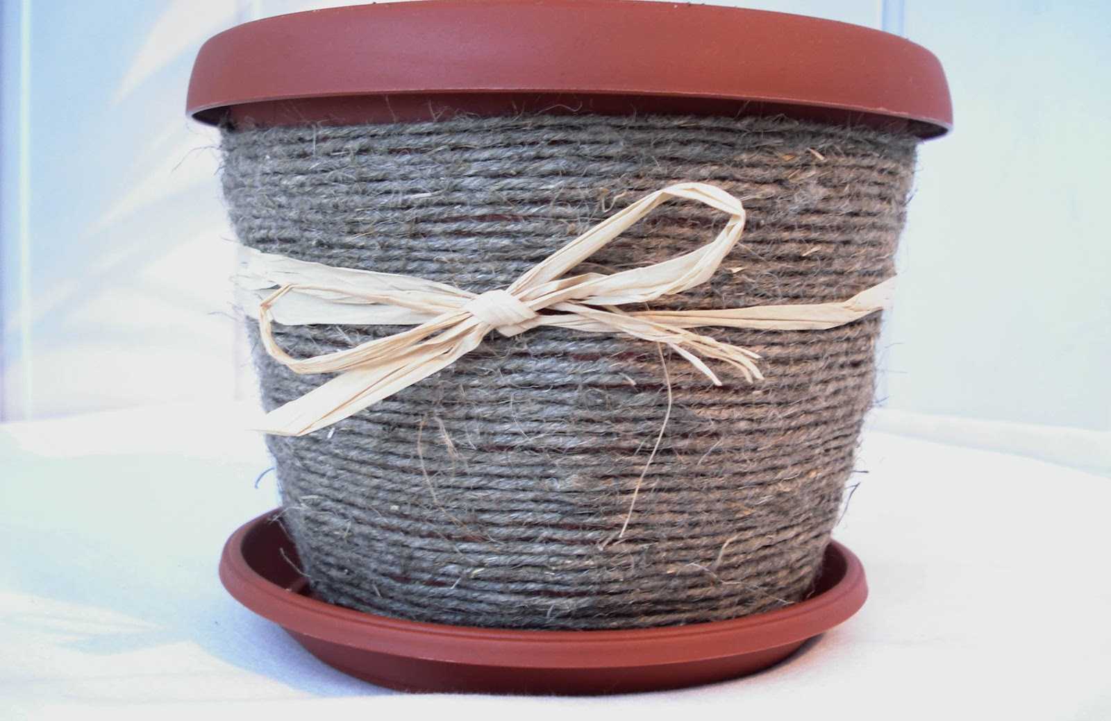 For the decoration of flower pots, the use of ropes and threads in different versions is well suited. Consider a few: