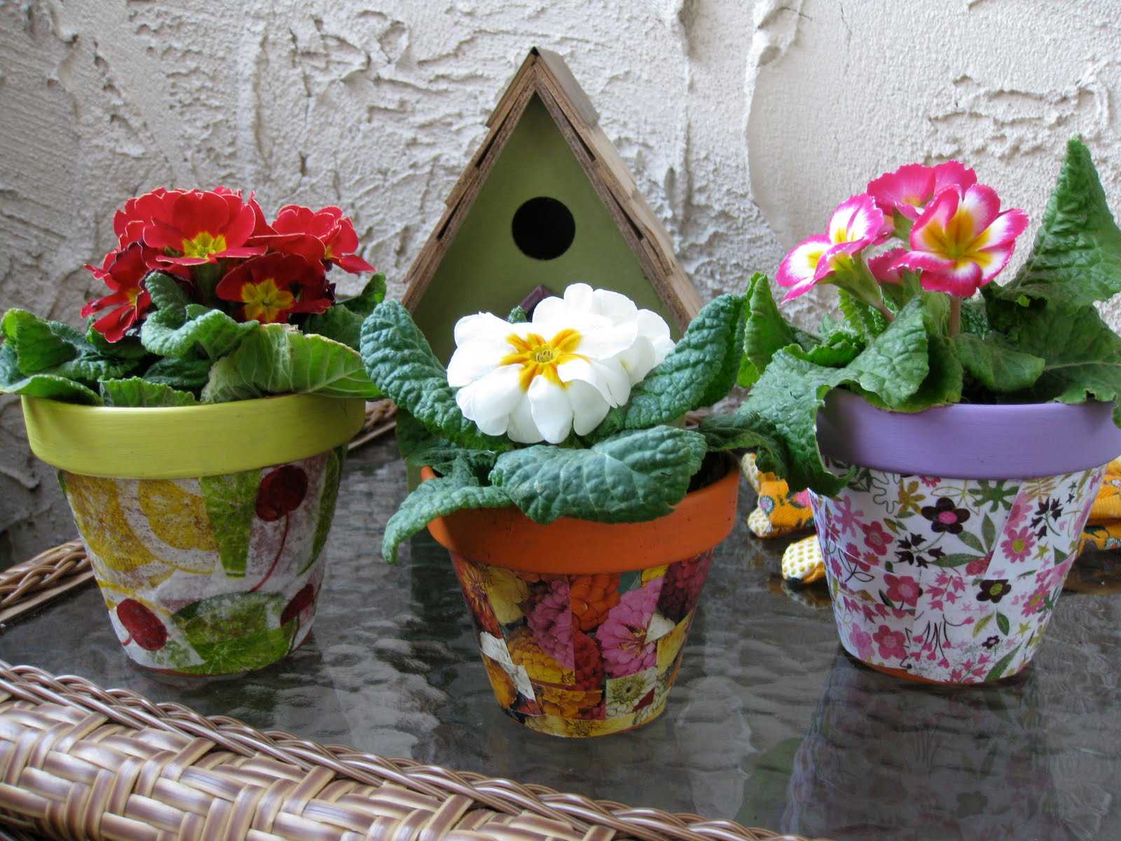 To decorate flower pots, you can use various materials, even paper or napkins. Transfer the selected pattern from paper to the base using the decoupage technique. This requires: