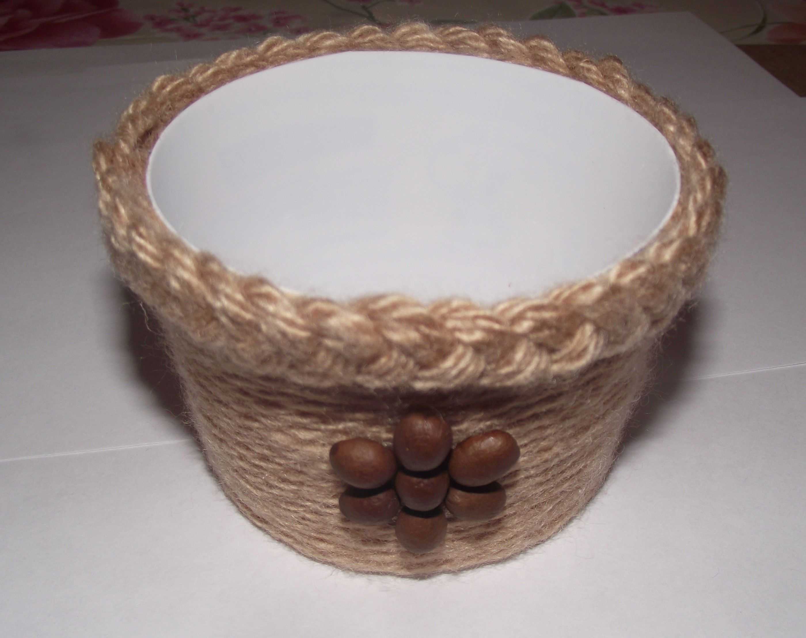 Twine. A pot trimmed with this material will look attractive and restrained. It is necessary to grease the pot in a circle with glue, and tie with threads, leaning them tightly against each other. Get the original foundation. It can be decorated with various decorations to your taste, or left in this form.