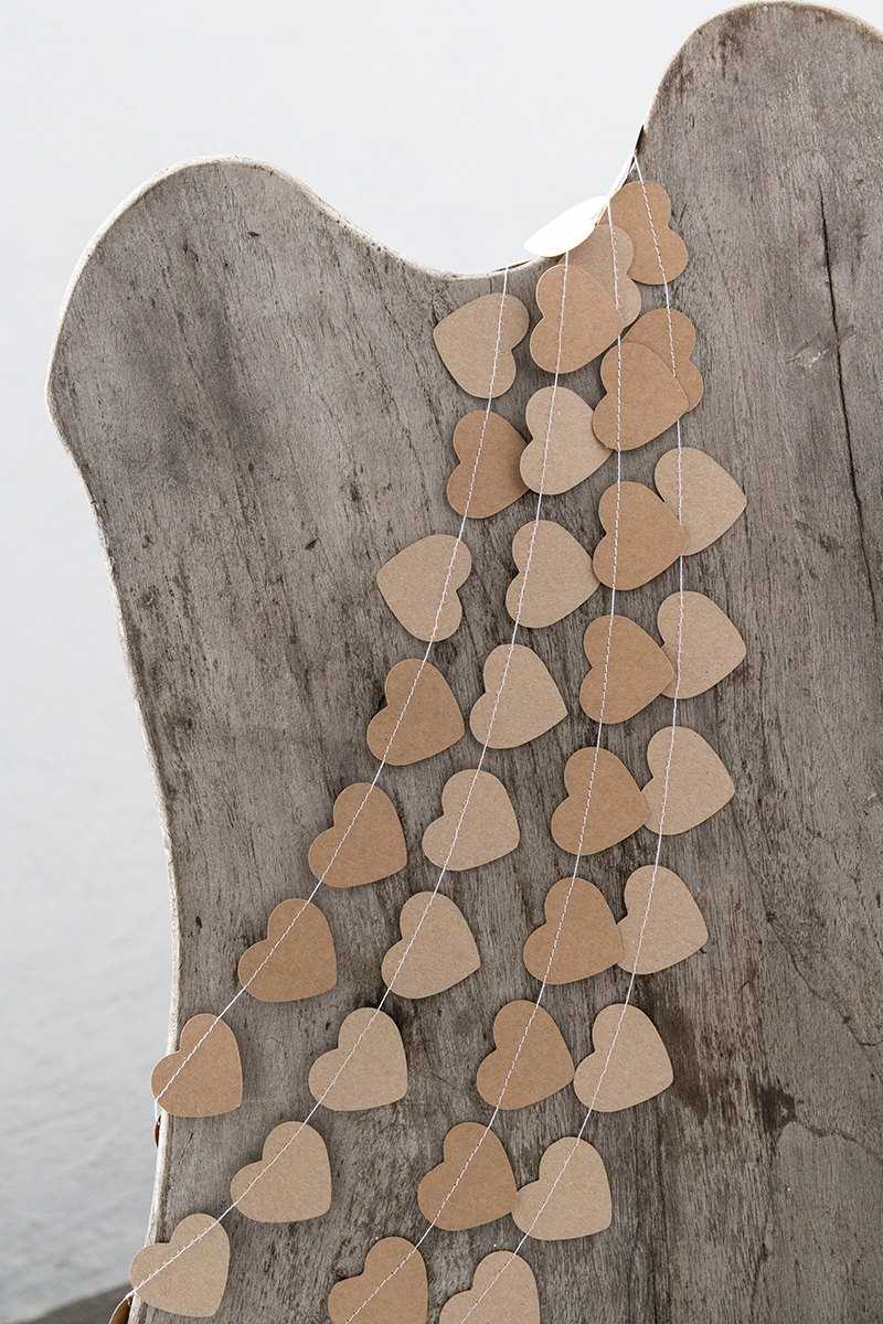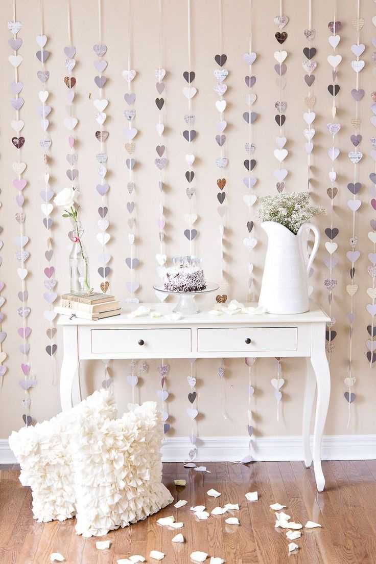 For a volume garland, you need to cut out a lot of hearts from colored paper (you can take a bright scrapbook paper with a floral pattern). Fold them 2-3 together, sew in the center with a strong thread, leaving 30-40 centimeters between the elements. Gently bend the "petals", giving the hearts a volume. After preparing several of these threads, attach them to the ceiling or doorway in the form of a curtain.