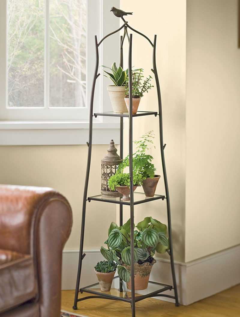 In the corner of the room you can put a bookcase with flowers