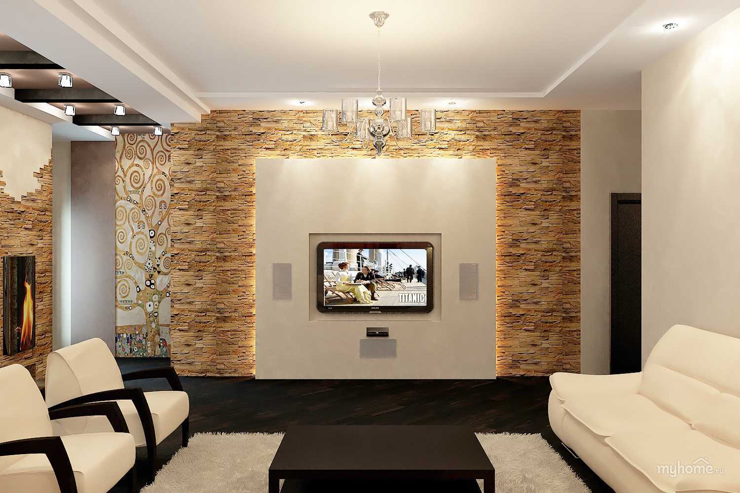 In a thoughtful design, no color should fall out of the general solution. Classic - 3 primary colors, 2 auxiliary (contrasts or variations of shades) and 1 emotional emphasis. In the presence of masonry in the interior of a living room, this principle cannot be ignored. The shade of the stone should coincide with the choice of the main background or make up a competent contrast in relation to another finish. - Size and shape.