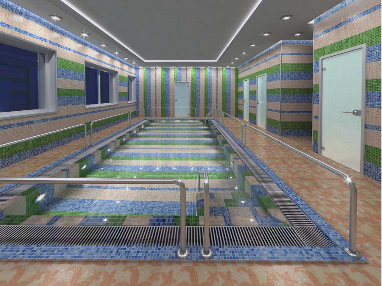 The interior decoration of the pool should start with the decoration of the bowl. Decorative film in a closed pond looks cheap, so this option should be immediately discarded. Natural stone is also good only in open space. The best solution would be ceramic or mosaic. The choice of decoration materials is determined by the shape of the bowl; a mesh-based mosaic is more convenient for the design of curved lines.