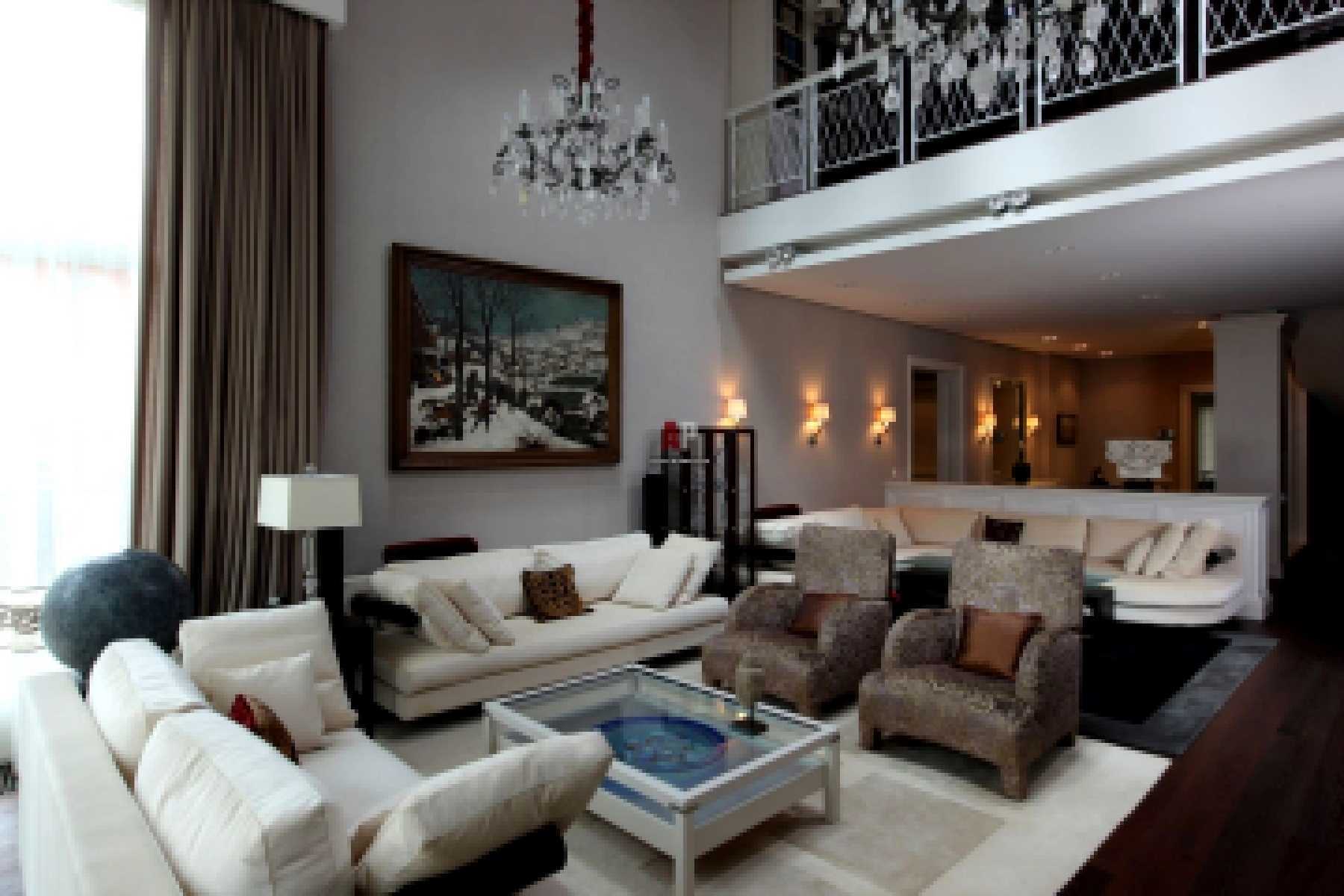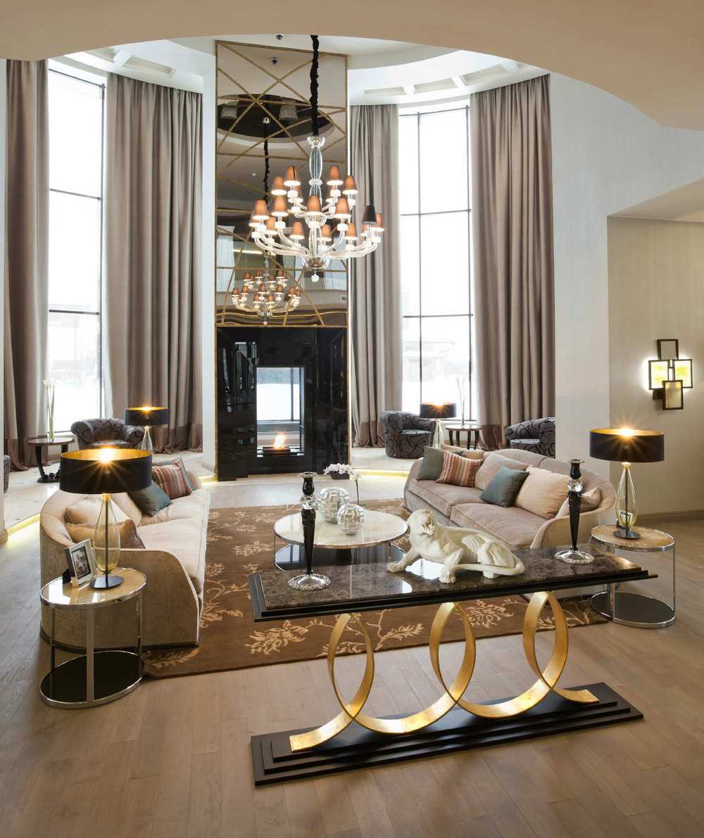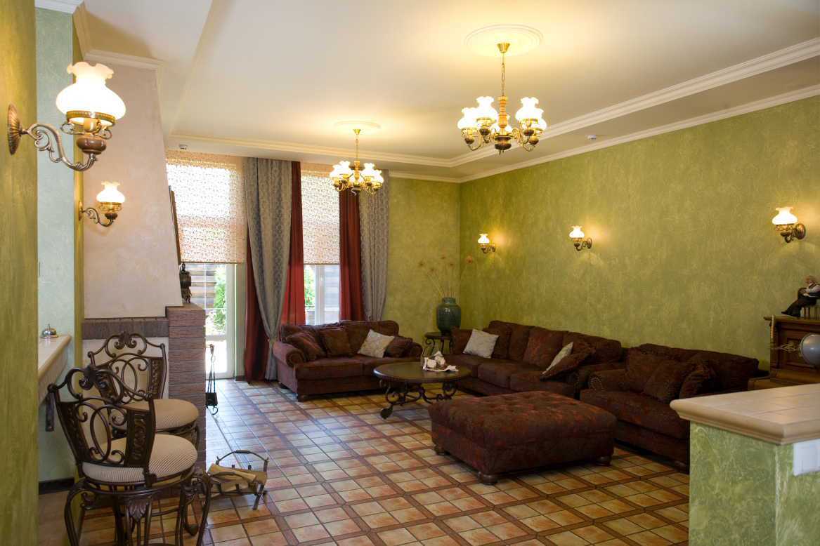 A good option would be a ceiling chandelier with large shades on long metal chains or lamps with decorative elements made of crystal. The ideal complement would be floor lamps or floor lamps, combined with chandeliers and lamps.