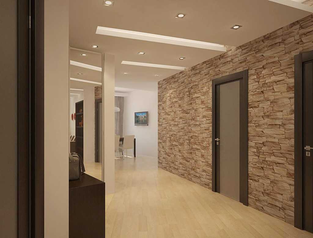 The original wall cladding is an excellent means of zoning large rooms. The combination of a stone surface of different textures - marble tiles, crushed sandstone and “wild” stone in the form of masonry will look inimitable.