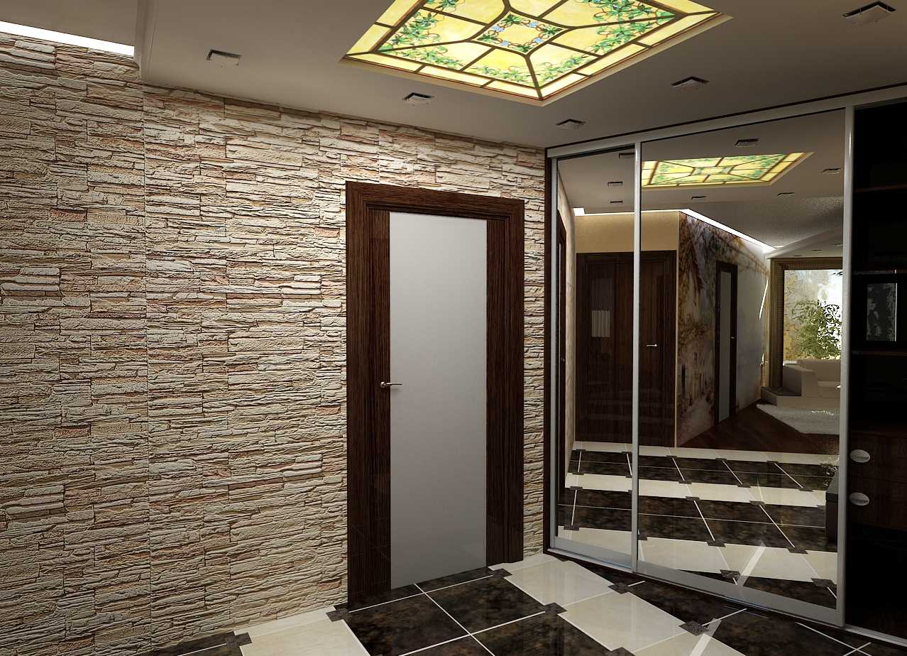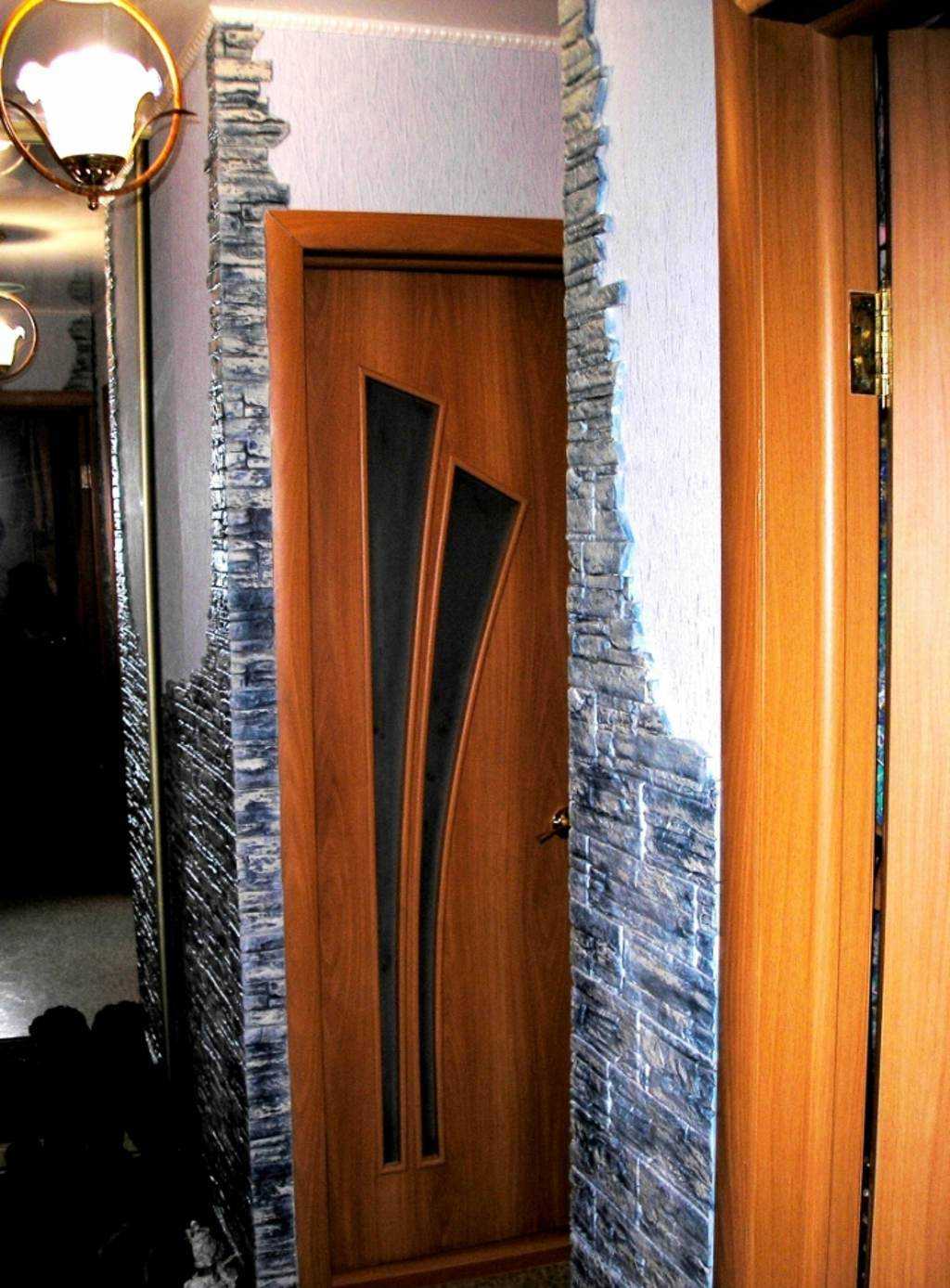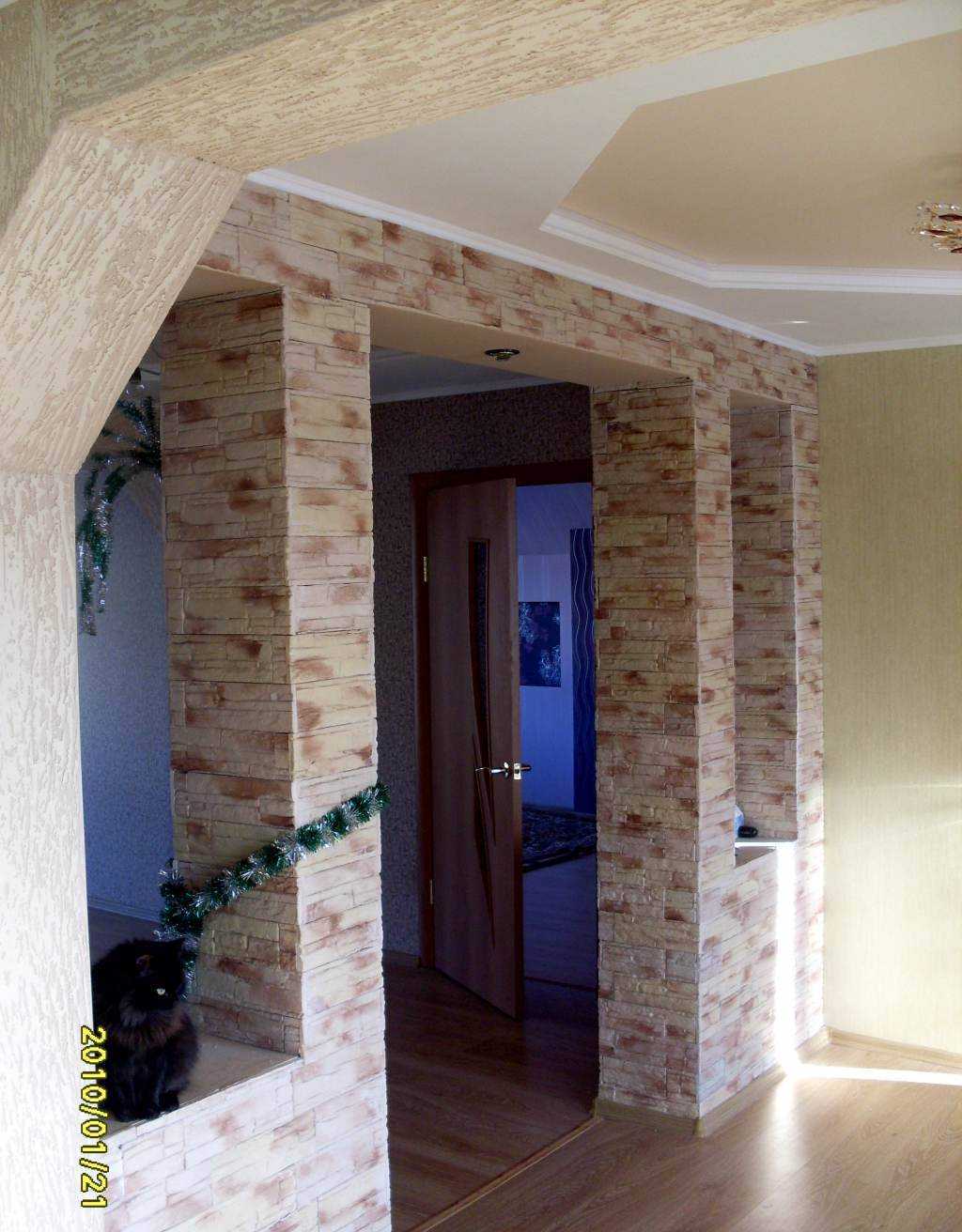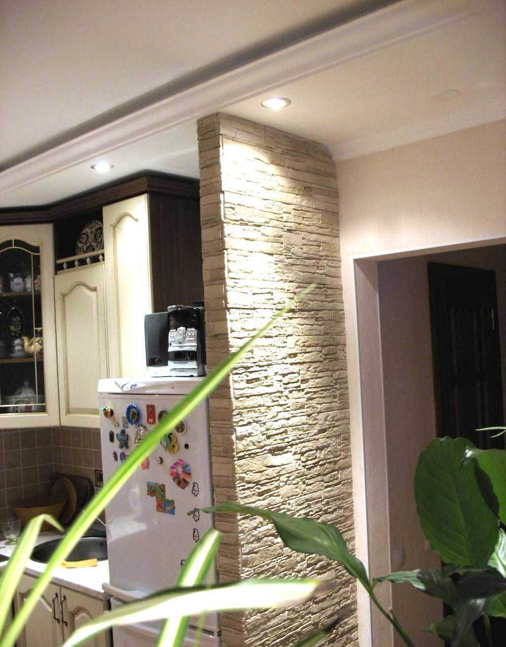 Rectangular and rounded columns are rarely made of solid stone, but they would be very heavy, which would create difficulties with transportation and installation. Finished forms with stone cladding create a unique flavor in the hallway, especially when the finish is duplicated on the walls or individual panels.