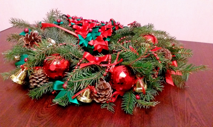 Decorate the finished product with Christmas tree branches, balls and red ribbon bows.