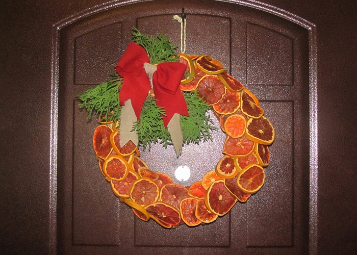 | Fruits, berries | Dried slices of oranges, lemons can be attached both to the frame itself and on top of spruce needles, paper elements, bows. |