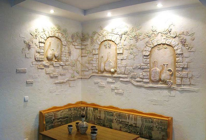 Thanks to the plaster, it will be possible to create a unique relief, a deep texture. With its help, it will be easy to transform both the whole plane and its individual elements. The material is applied to any base - concrete, brick, as well as to drywall, wood. The finish will be moisture resistant. She is not afraid of direct sunlight. Also, this coating is quite easy to care for.