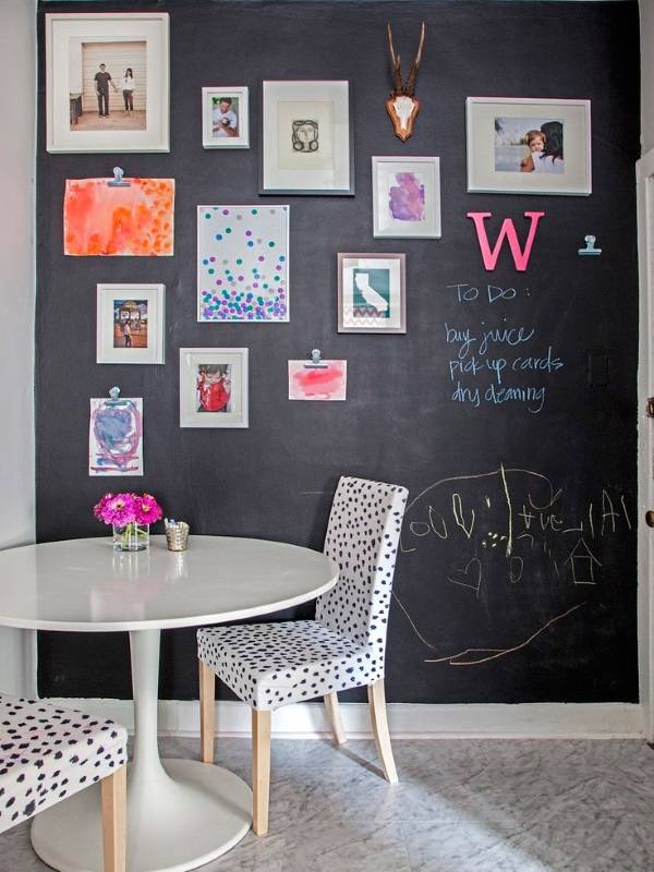 - Another stylish, interesting idea would be to buy a slate wall.Children will especially like it. On it you can write messages to each other, wishes, positive quotes, poems. The item will be useful - write on it your favorite recipes or a list of products.