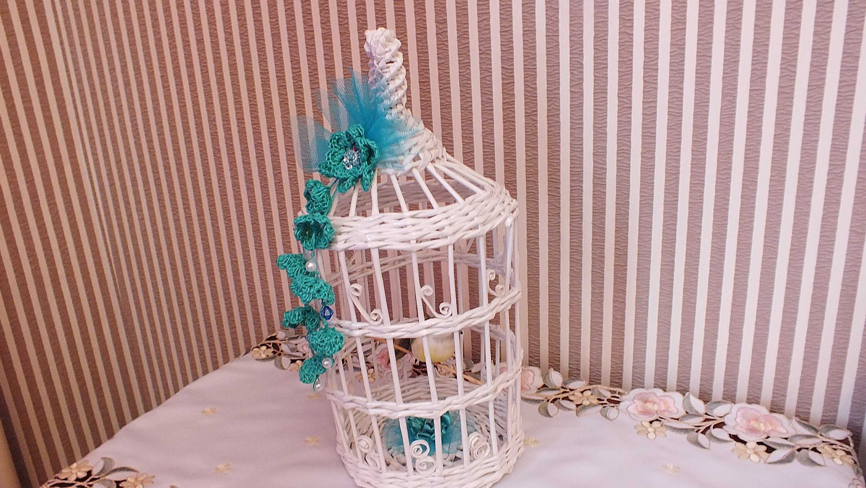 Twist many thin tubes from the newspaper. Of these, you can weave the base - the bottom of the cage, rods and roof. Color and decorate the cage with flowers. If you choose the colors of natural materials - to create an imitation of tree branches, you can decorate the cage with flowers from flax, burlap, natural materials - branches, berries, cones. She will decorate the house in a rustic style.