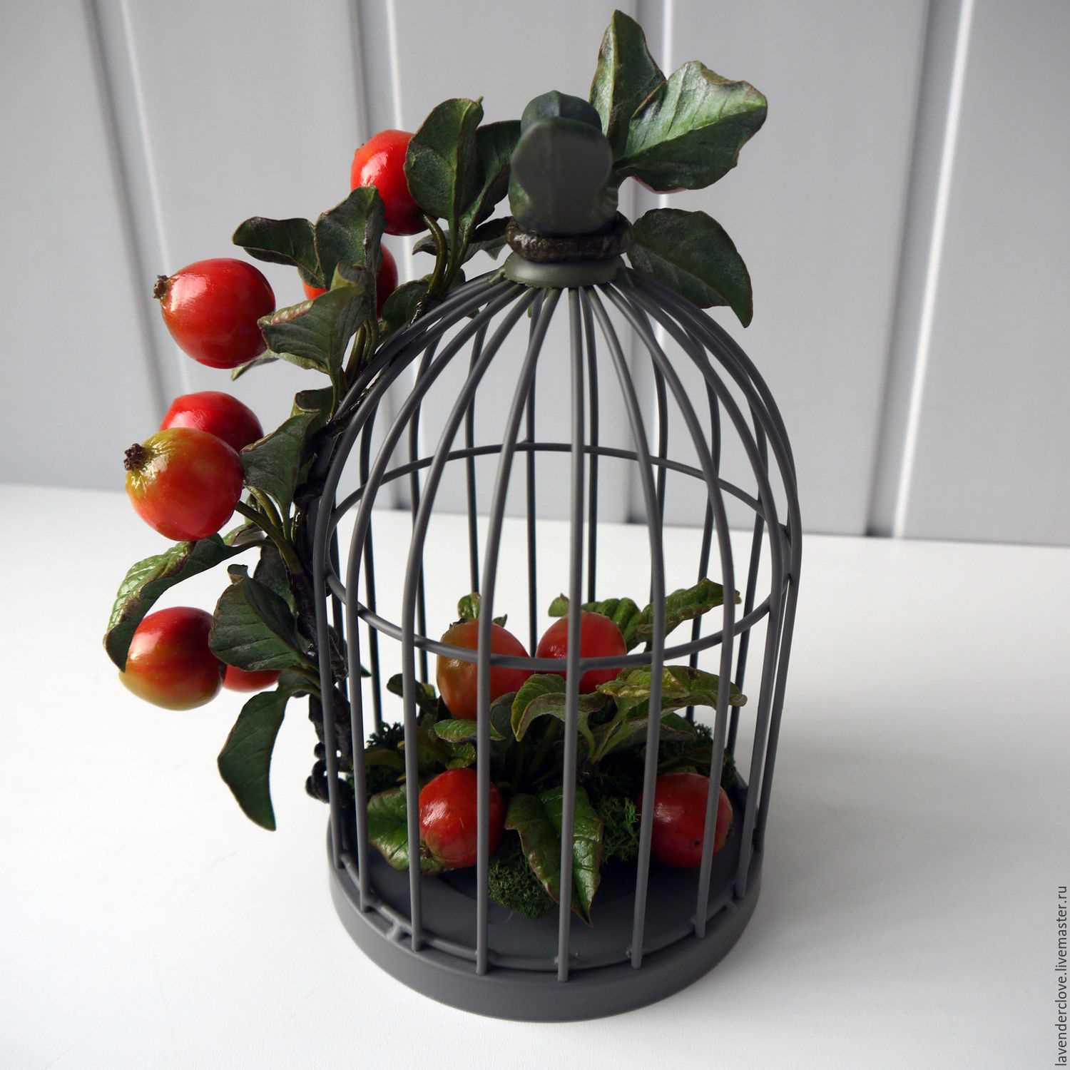 If you don’t want to take care of a live bird, “put” a dummy in a cage. You can create a whole composition - a nest with bird eggs-dummies, fruit and flower decoration from twigs, flowers and dummies of berries, fruits. Bright autumn red-orange palette will decorate the room, bring warmth of the autumn garden to it.