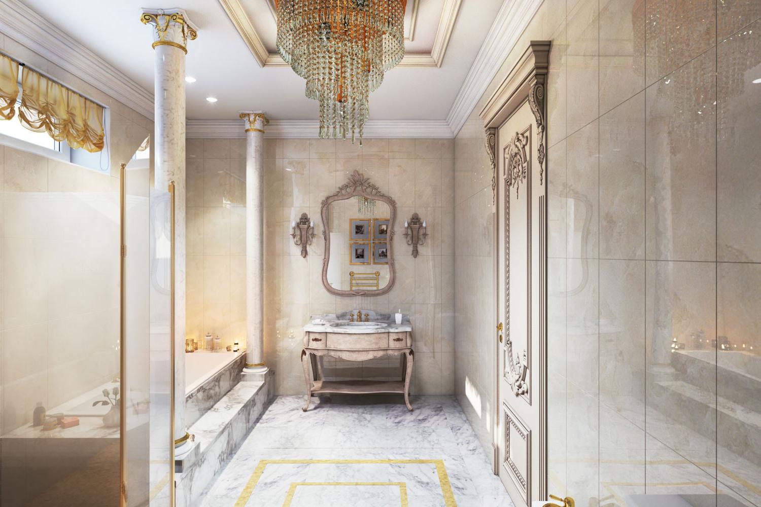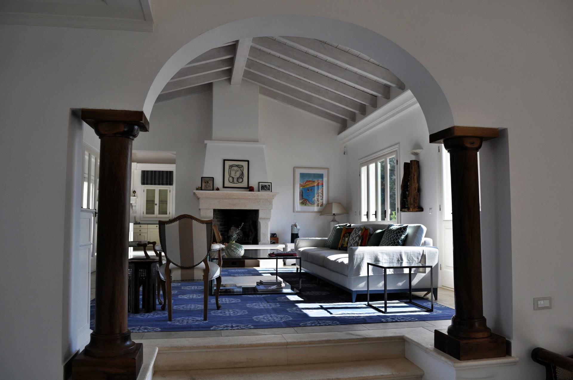 The interior doorways are replaced by arches with patterned architraves mounted on high antique columns refined to the ceiling.