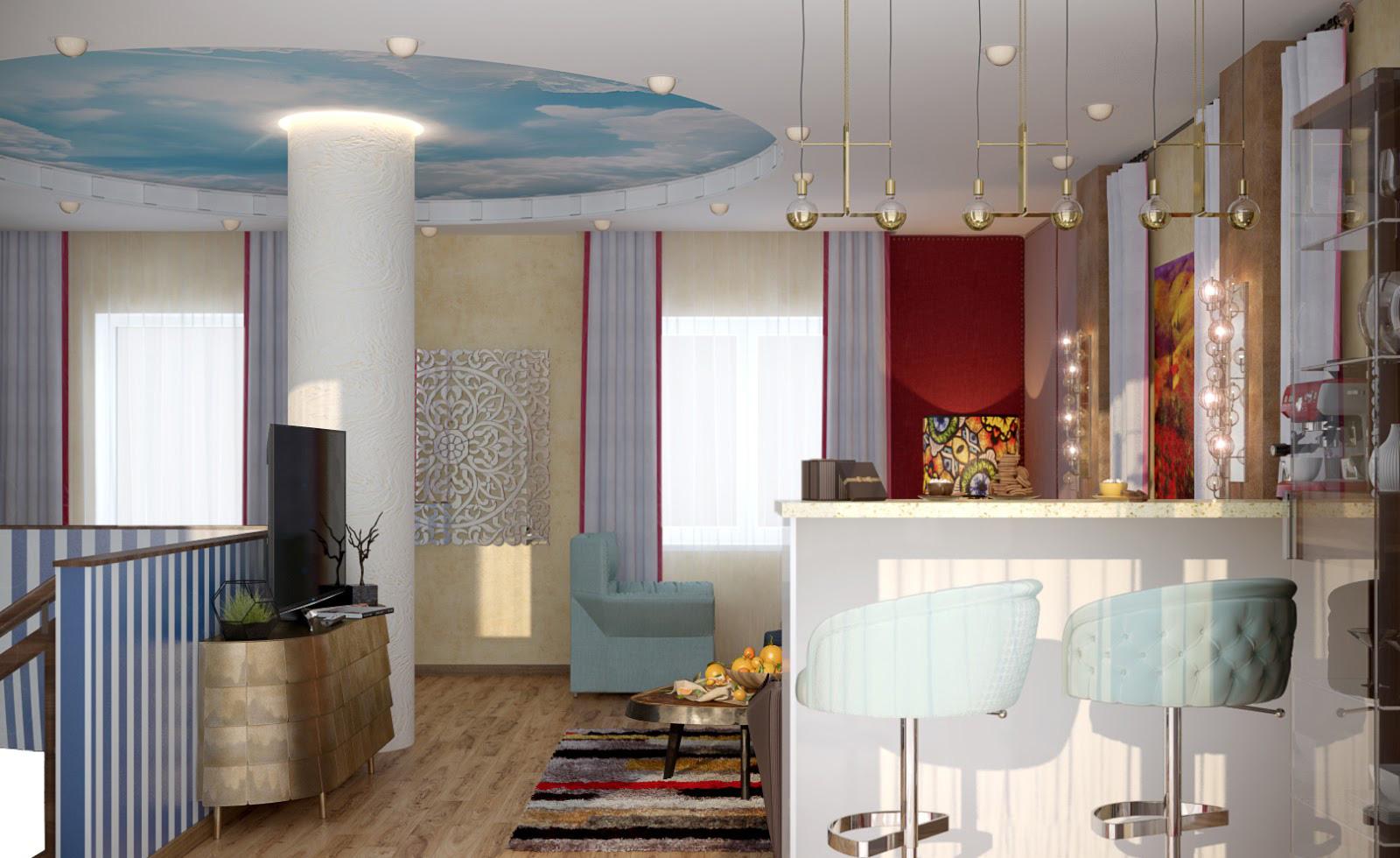 Colonnade zoning is possible in the construction of large studio apartments. At the same time, the columns are decorated with lights (wall lights) and other decorative elements that complement and emphasize the overall style idea of the room.