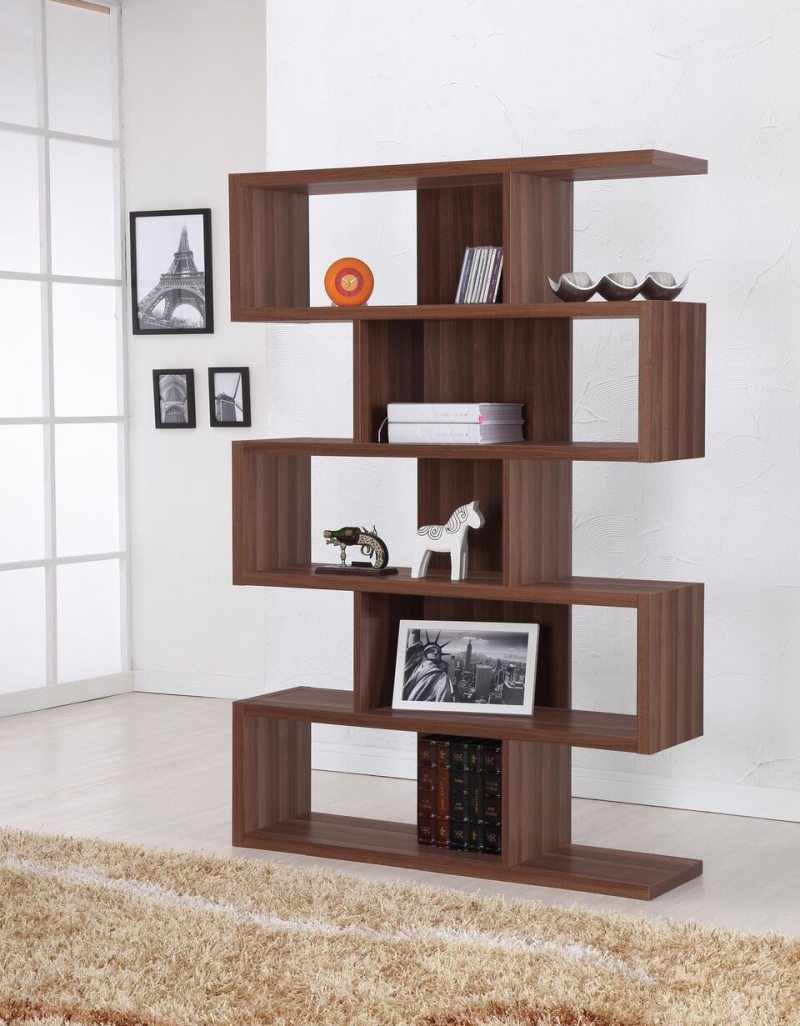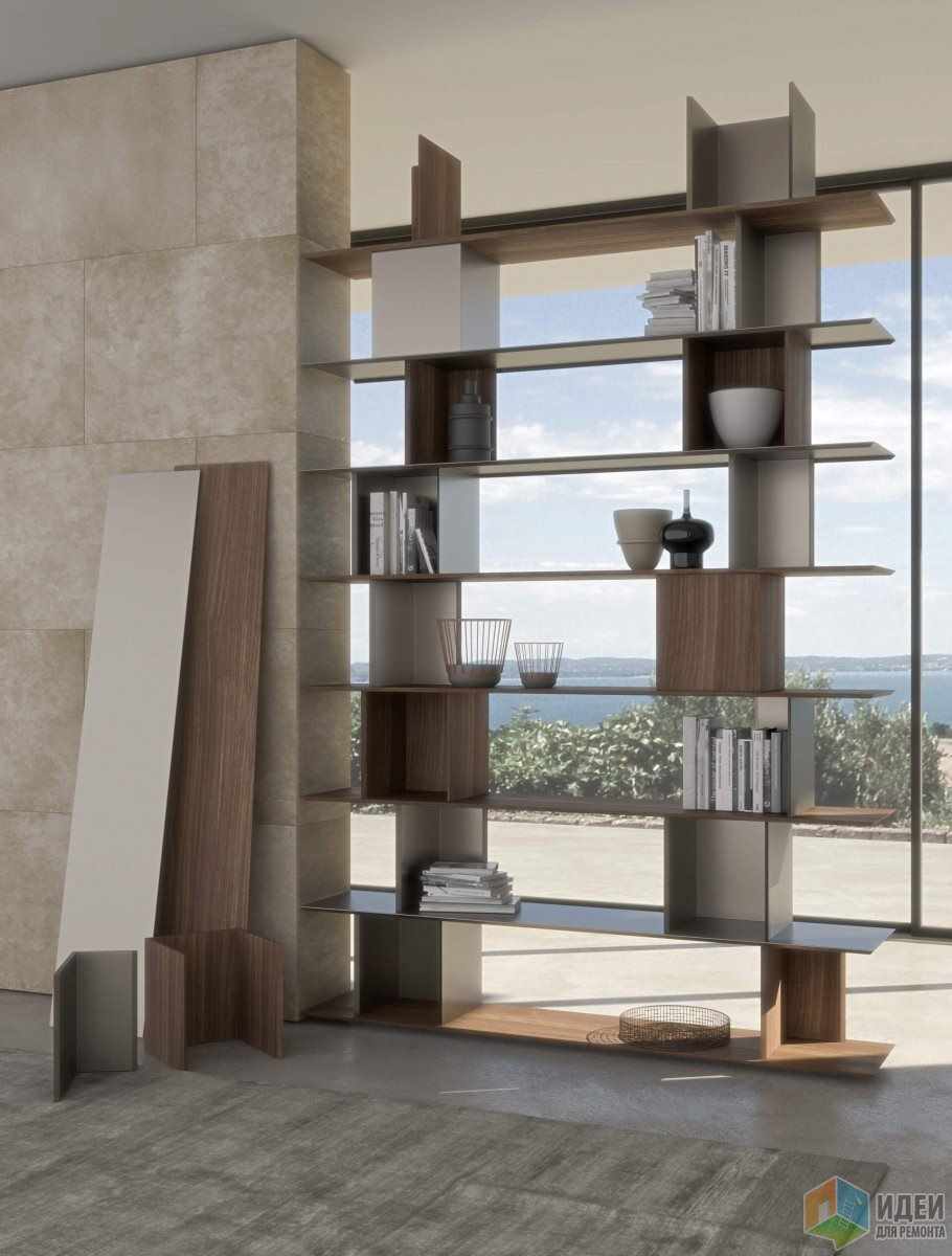 In the living room, the shelves combined with the bedroom can serve as a partition, both deaf and through, made in different forms. For example, in the form of an ordinary closet or stairs, slides.