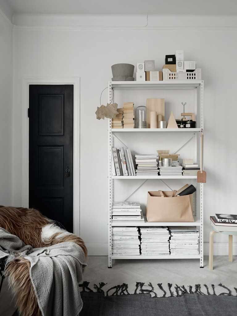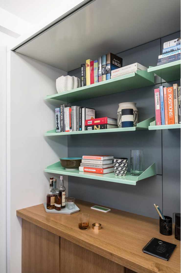 Hinged open shelves of light or vice versa dark shades (white, gray, blue or black) will look good. |