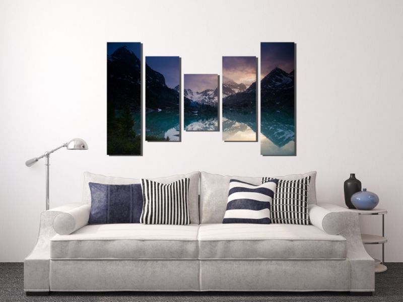 The plot of the modular picture is able to emphasize the features of the room. For example, canvases with a take-off airplane fit perfectly into an elongated living room with a high ceiling