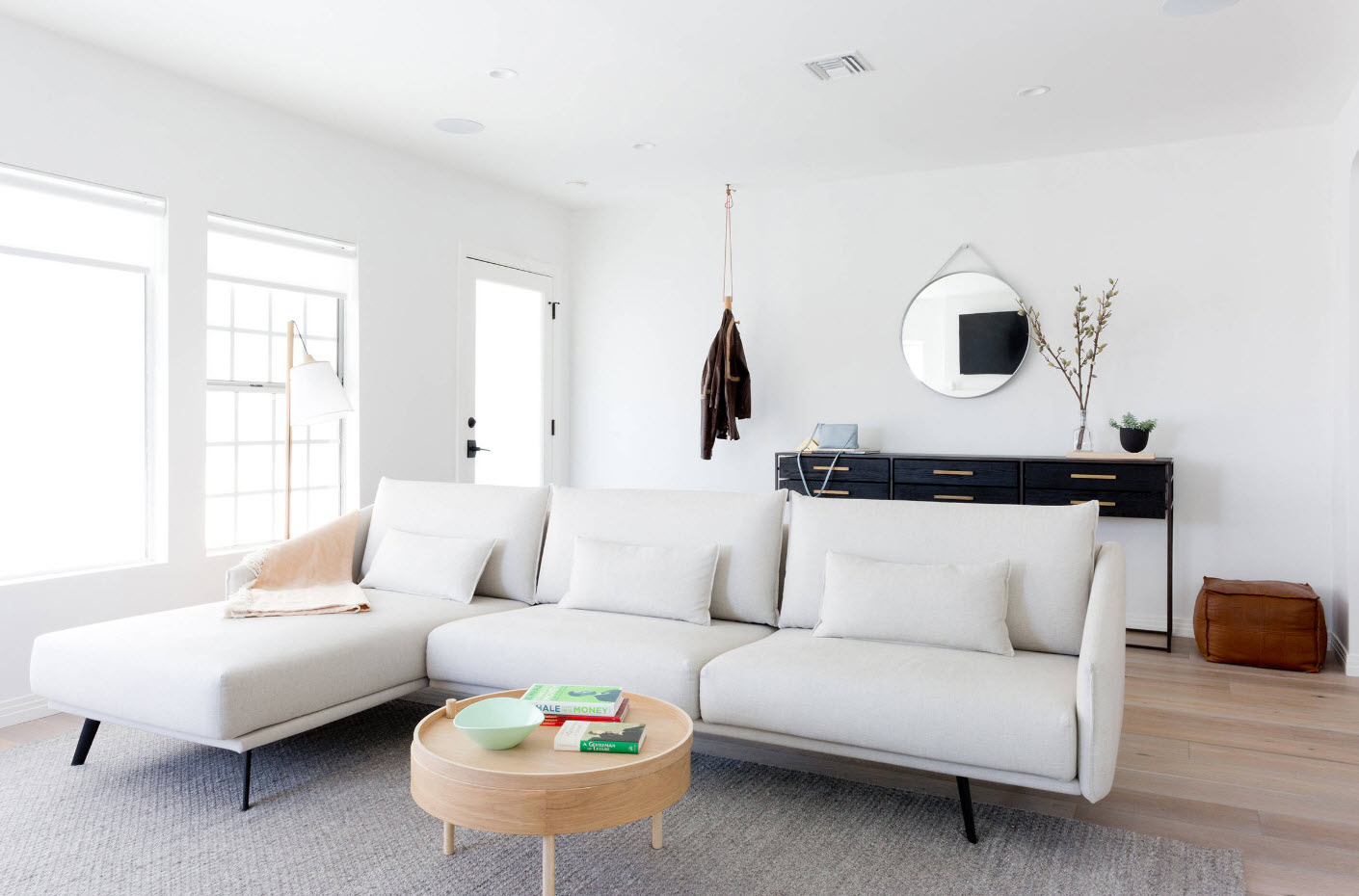 Equipping a living room with a corner white sofa