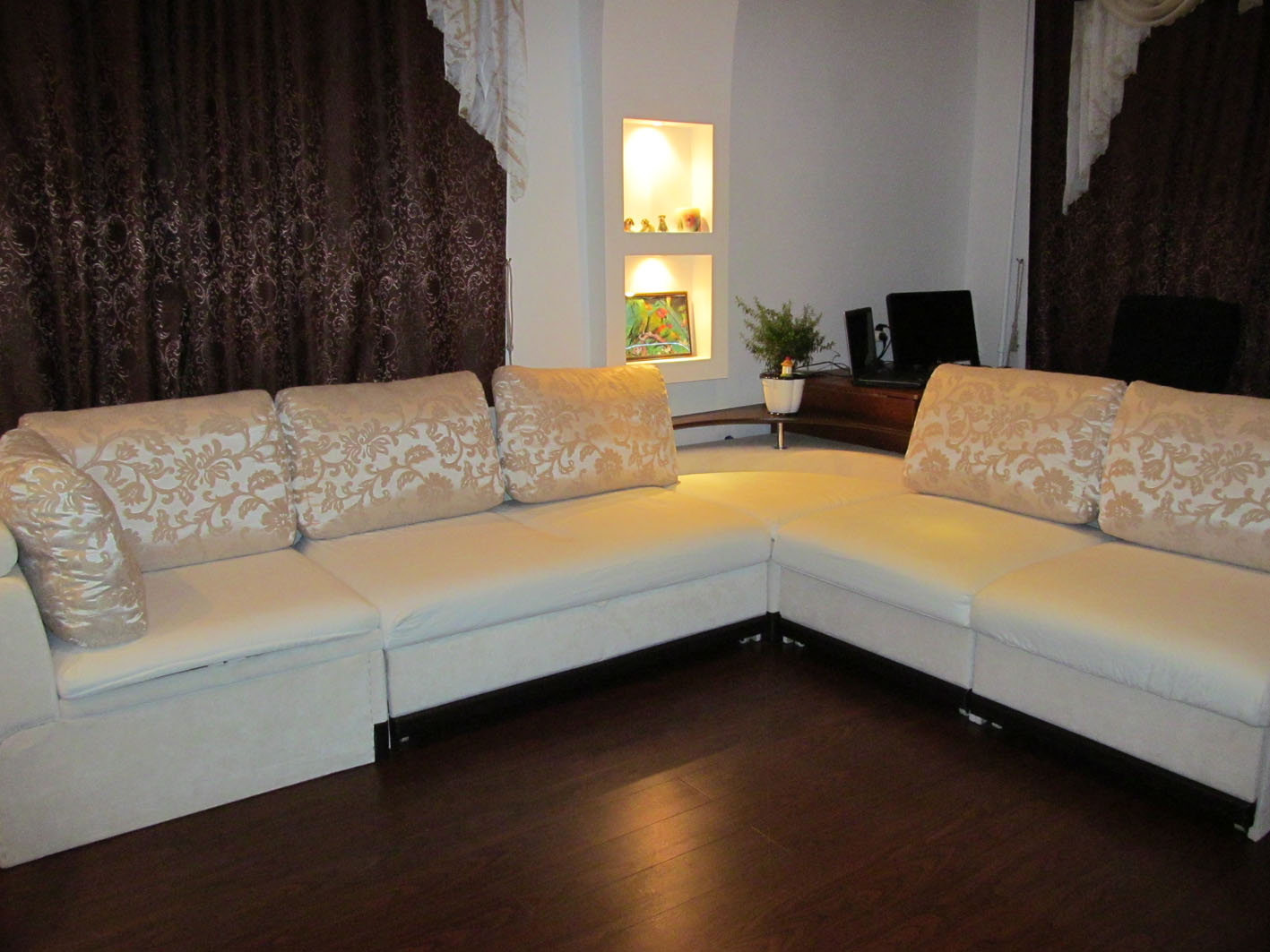 Oddly enough, even in the center of the room a corner white sofa can look relevant. Nevertheless, for small ones, it is preferable to place either close to the corner walls with windows, or with one window at the opposite wall. Thus, the space will visually expand.