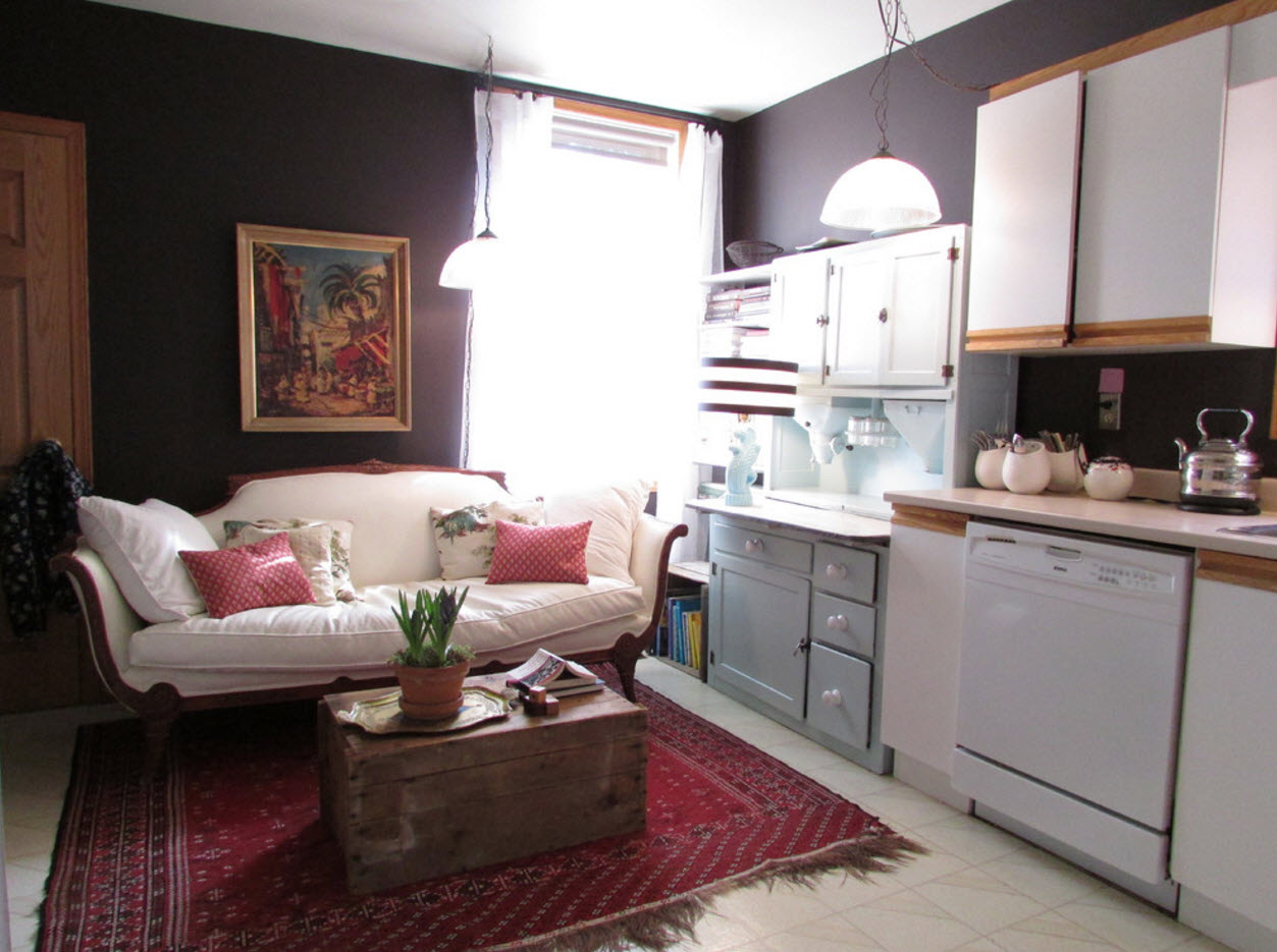 In the classic version, designers prefer to combine white sofas with dark shades of walls. Here you can often find shades of chocolate, coffee, dark gray tones. At the same time, sharply saturated colors are added contrary to such colors - orange, red, yellow, green, juicy blue or blue. The fact is that in the classical construction of the interior it is necessary to combine calm tones and add a bright accent, which in this case is a rich tone. It should be borne in mind that against the background of dark walls a white sofa will seem even whiter, and therefore it is necessary to stop the emphasis on it and it is advisable to add some bright details in the form of pillows.