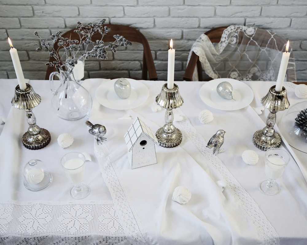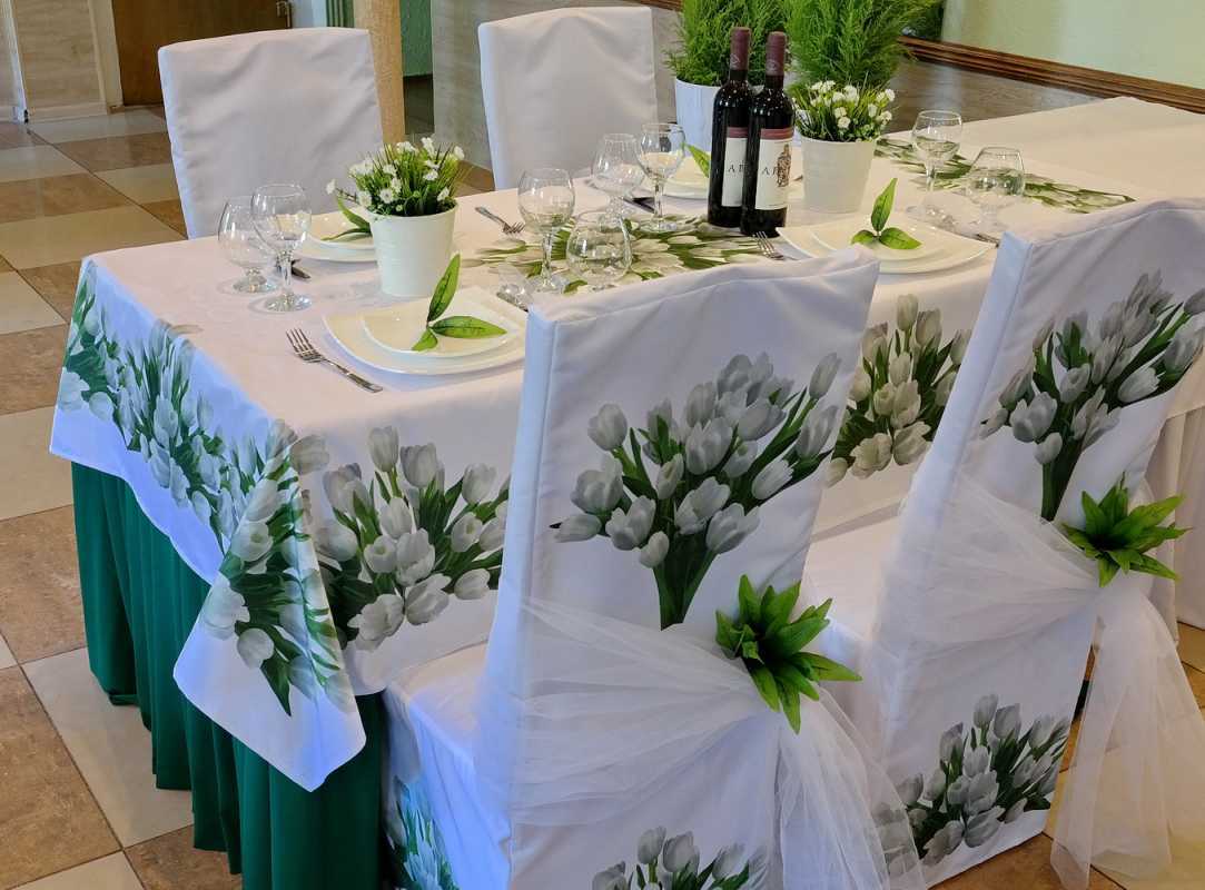 Solemn table setting is the best way to create a festive mood. Tables are decorated in different ways, the basis is a colored or lace tablecloth and chair covers. On the tablecloth, each guest can also be served linen napkins or coasters for hot food made from decorative materials.