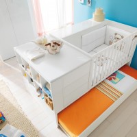 - Children's transforming bed with a chest of drawers and a changing table.It would seem that more could be desired, but some models will surprise you even more. There are transformers that provide an opportunity in the future, already for an adult child, to make a small table that rests on the chest cover and the lattice wall. From an unnecessary back wall of the bed it is easy to make, for example, a board for creativity. Thus, a variation of the model with a chest of drawers and a changing table is appropriate and practical in the long term as a child grows up.