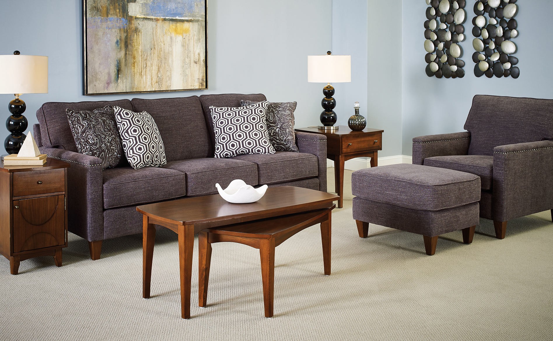 A combination of a light gray sofa and a charcoal armchair in a classic-style living room